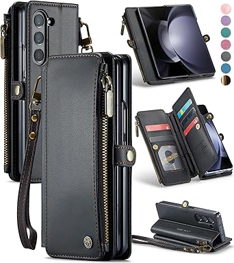 Defencase Wallet Case Compatible with Samsung Galaxy Z Fold 5 with RFID Blocking Card Holder & S Pen Holder Slot PU Leather Magnetic Snap Flip Zipper Strap Phone Case Fit for Galaxy Z Fold 5, Black