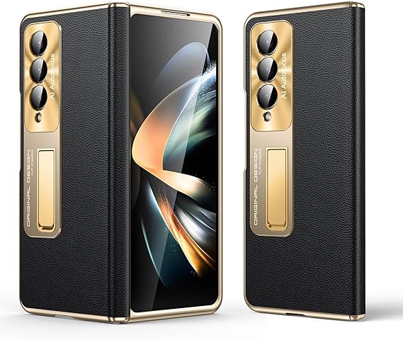 for Samsung Galaxy Z Fold 4 Case, Electroplated Frame, Luxury Leather Back, Full Magnetic Hinge Protective, Screen Protector, Metal Stand, Thin & Slim Stand Phone Cover 5G 2023, Black