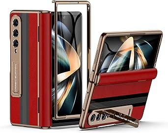 for Samsung Galaxy Z Fold 4 Phone Case [Luxury Premier Genuine Leather][Full Body Hinge Protection][Built-in Screen Protector][Kickstand Drop Proof Protective Cover] for Z Fold4 (Red)