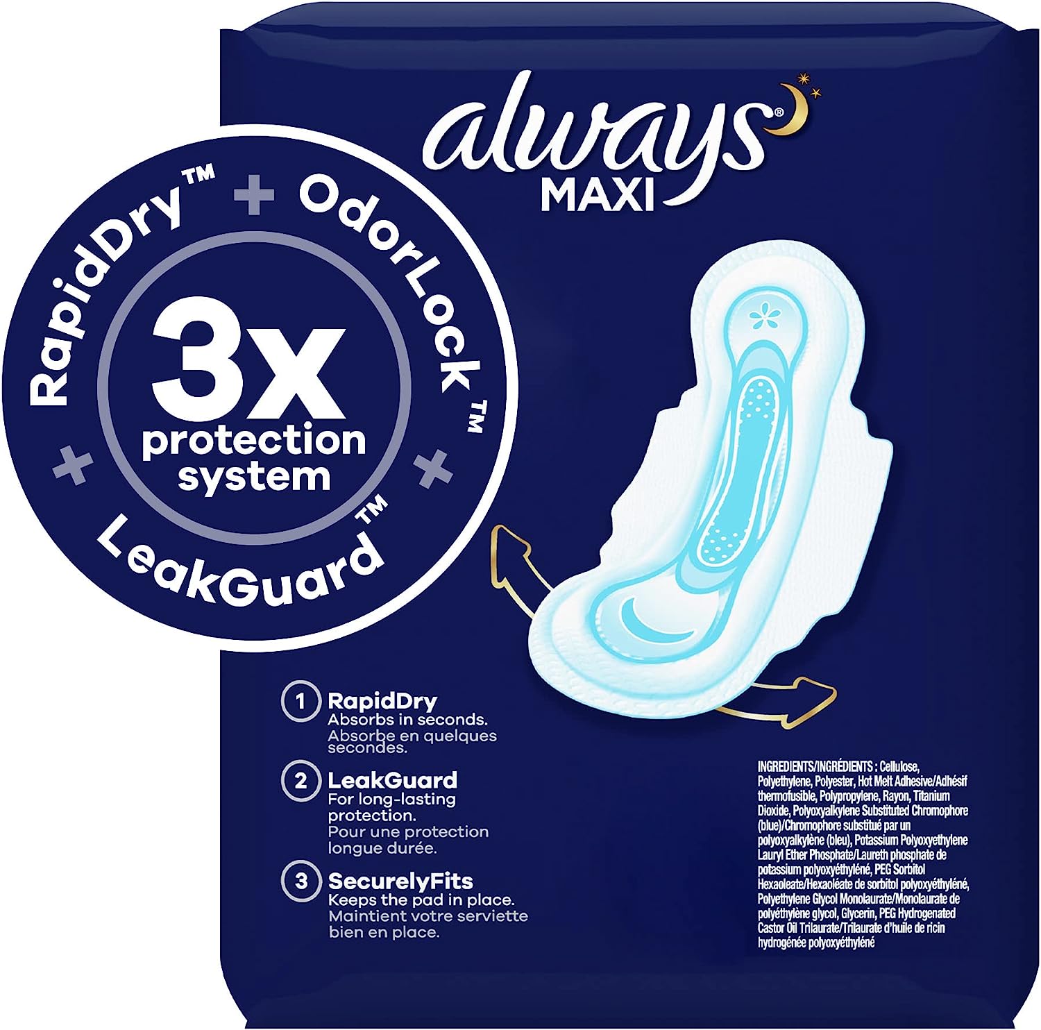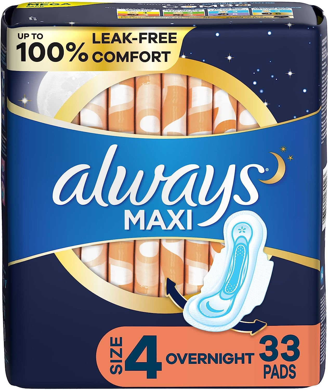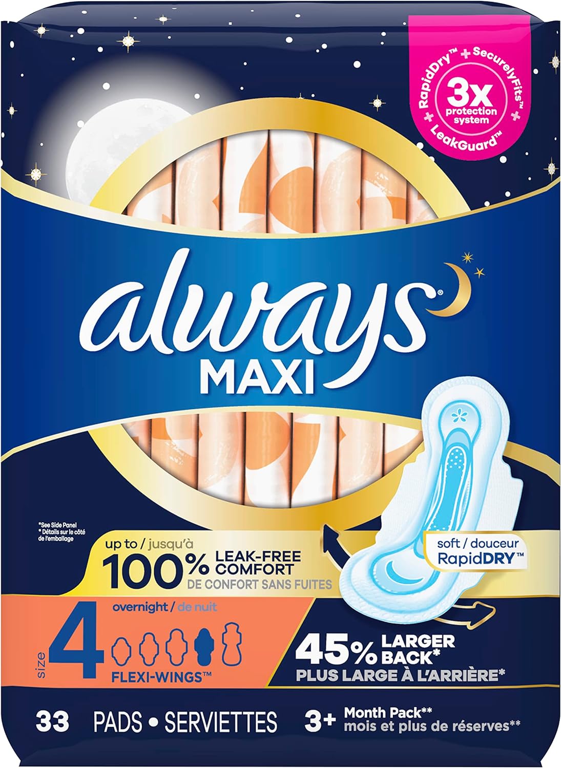 Always Maxi Size 4 Overnight Pads with Wings, Unscented, 33 Count