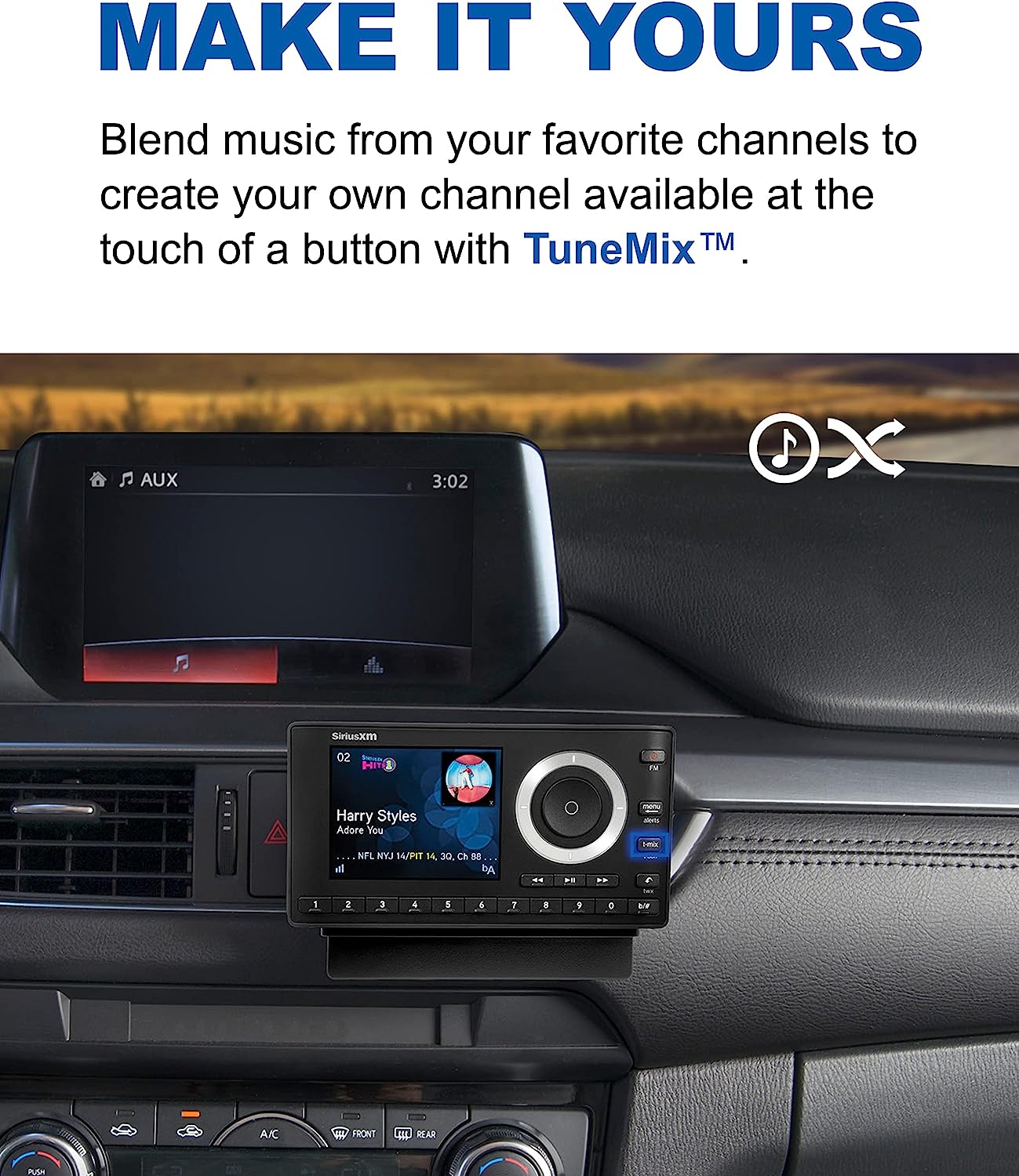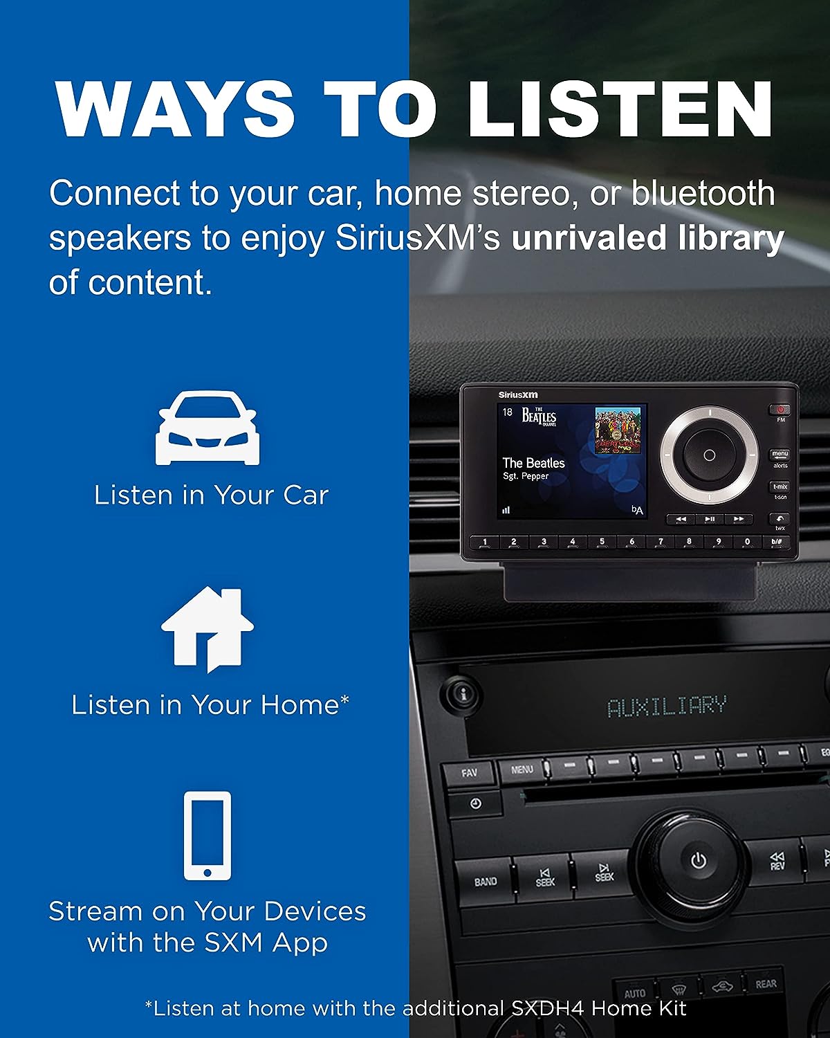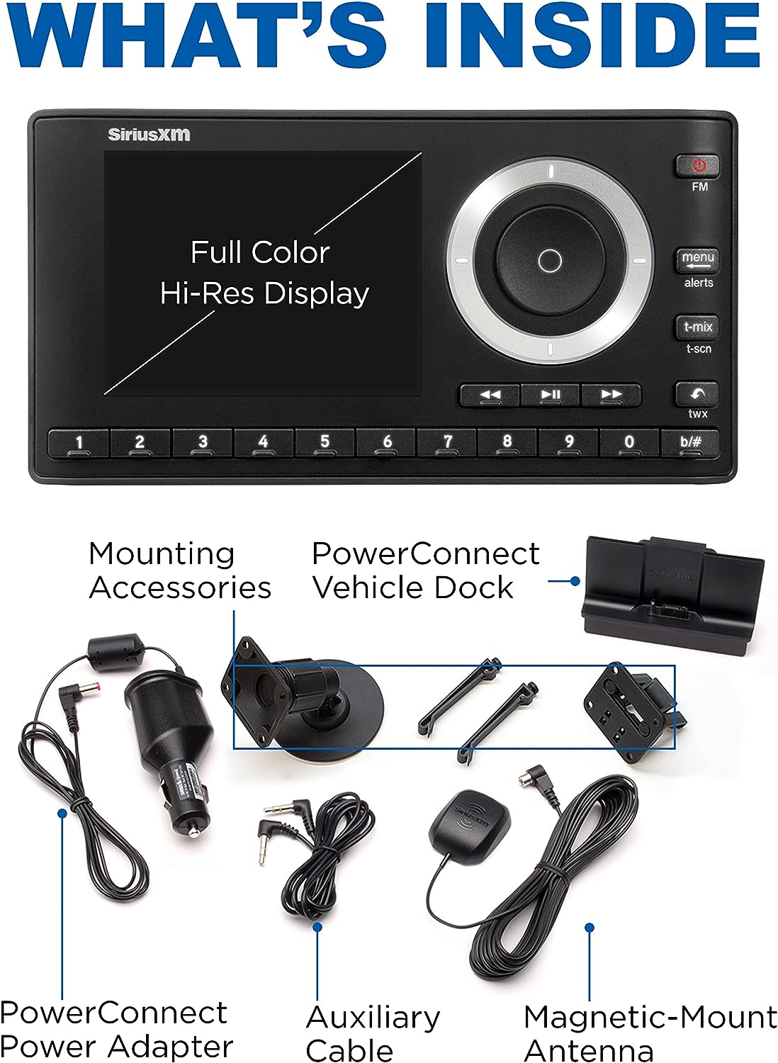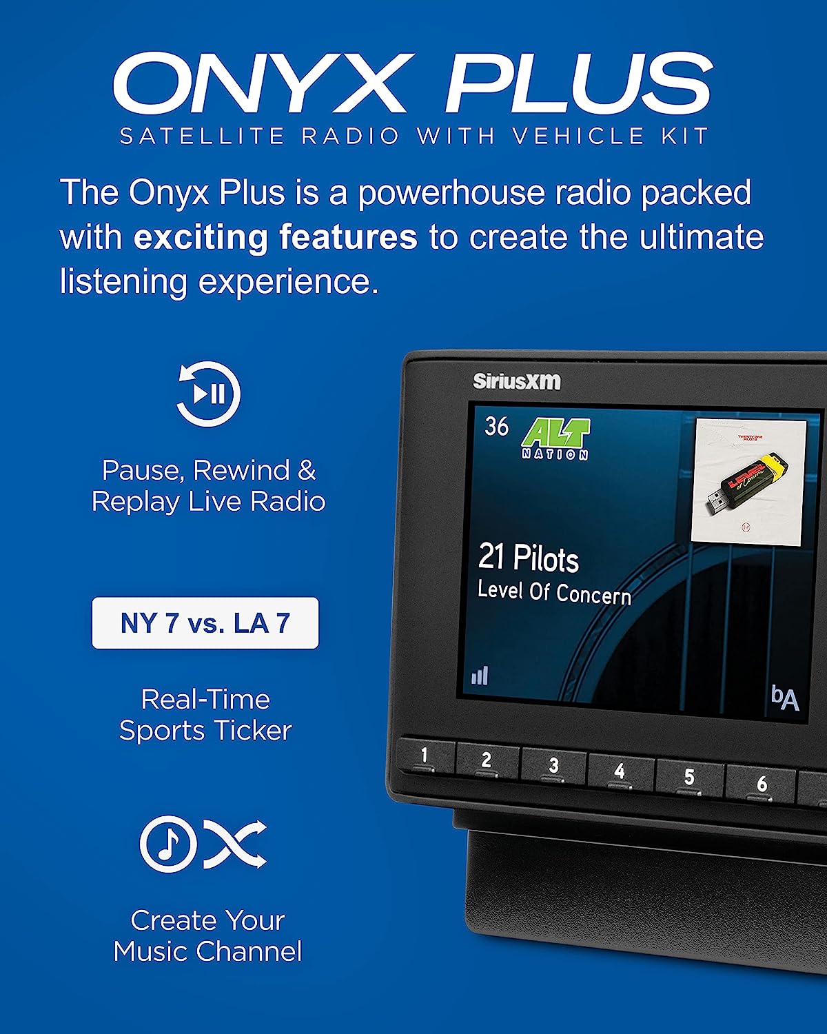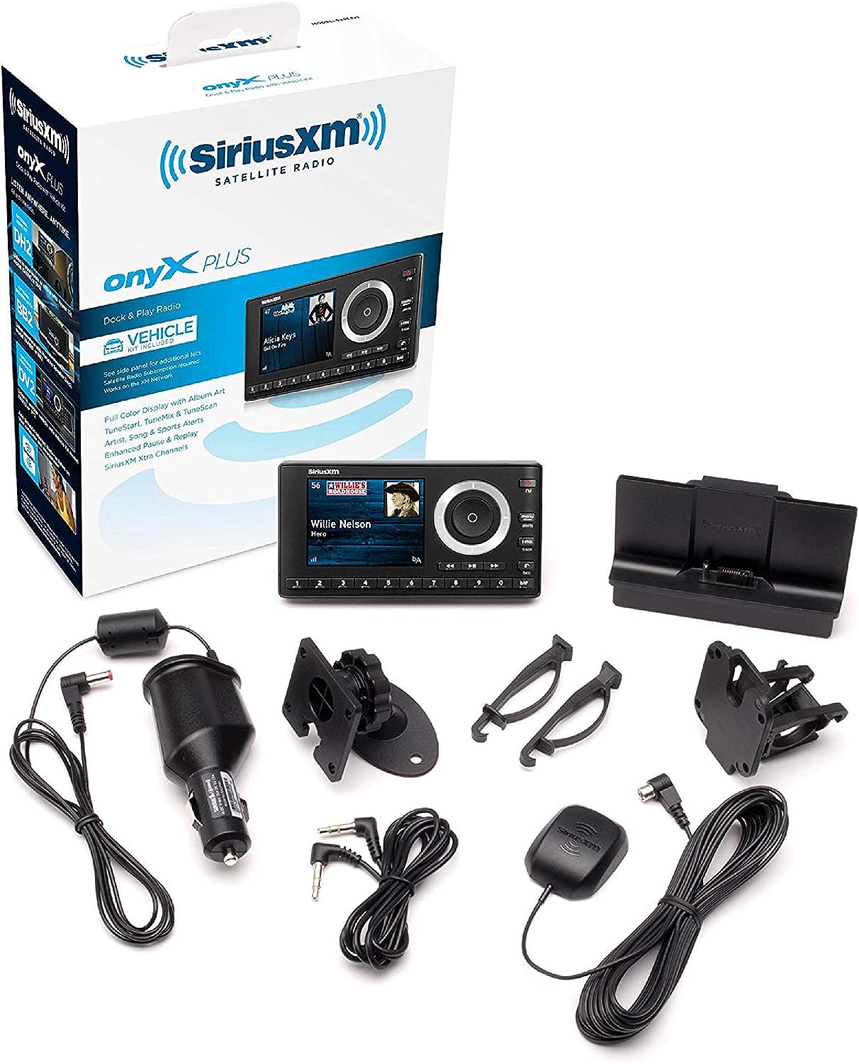 The SXPL1V1 Onyx Plus with Vehicle Kit allows you to connect, control, and enjoy SiriusXM through your in-dash audio system with controls on the full color display. Listen to your favorite channels with the ability to pause, rewind, and replay live satellite radio. The Onyx Plus with Vehicle Kit has advanced features that allow you to listen to your favorite SiriusXM channels where you can get alerted when artists, songs or teams are playing. Store up to 20 Smart Favorite channels. Automatically start songs from the beginning with TuneStart so you’ll never miss your favorite channel or use TuneScan to scan and select songs you missed from your SmartFavorite channels. If you’re feeling creative, use TuneMix to create your own music channel that’s a blend of songs from your favorite channels. Hear exclusive entertainment only available on SiriusXM like Howard Stern, Today Show Radio, Fox News, CNN and Kids Bop Radio. Plus live play-by-play sports from the NFL, MLB, NBA, NHL, the best games in college sports and NASCAR races. Hear dedicated ad-free music channels from your favorite artists like The Beatles Channel, U2 X-Radio, Eminem’s Shade 45, Kenny Chesney’s No Shoes Radio, Pitbull’s Globalization, Bruce Springsteen E Street Radio, Pearl Jam Radio, Dave Matthew's Band Radio and Jimmy Buffet’s Margaritaville. Receive 3 months free service when you subscribe to the “all access” package. If calling to activate your radio, provide your radio ID and mention “never miss a beat.” A 15 dollar activation fee and credit card are required for this offer. SiriusXM is where moments happen. Like the moment you hear your song. Or you laugh. Or your team takes the lead. These moments matter, and you’ll find them here, 24/7. In ad-free music, plus talk, sports, comedy, and news. Live and On Demand. And they’re on in your car, online or on the app so you won’t miss a thing. Subscription Sold Separately by SiriusXM.