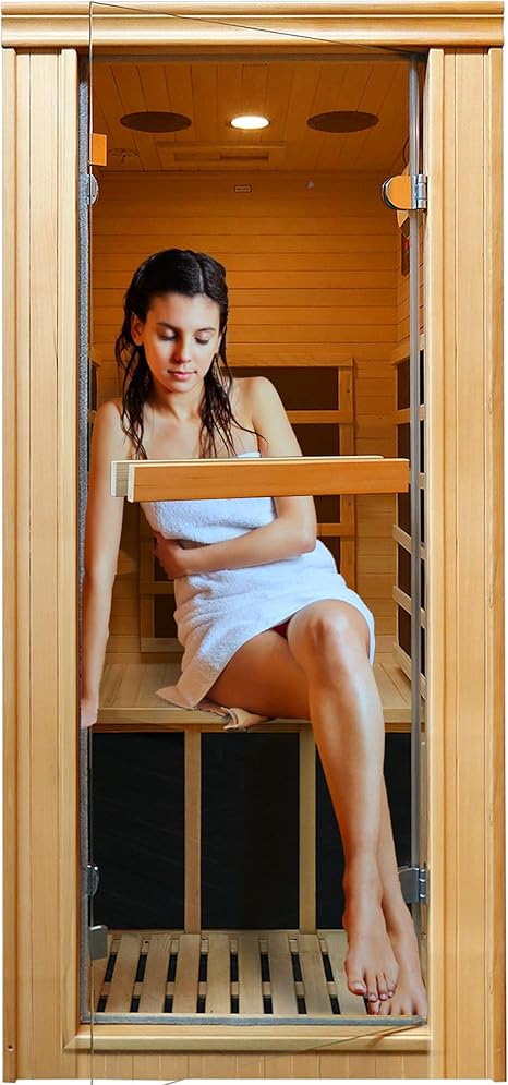 Far Infrared Sauna Canadian Hemlock 980W Low EMF Dry Sauna Single Person Spa Wooden Sauna, with Bluetooth Music Player, Ambient Light and Foot Control System 33 * 28 * 62 inch