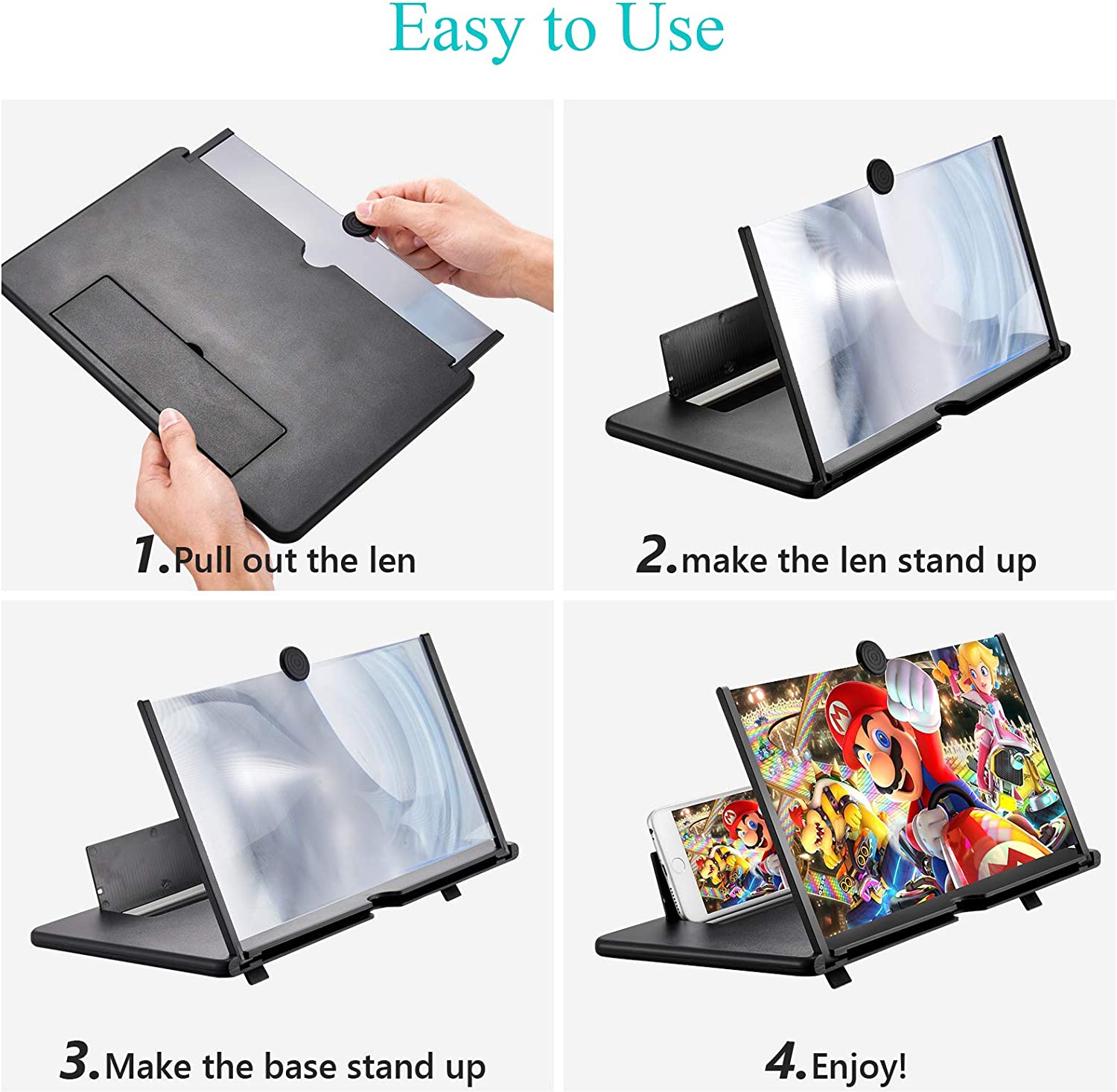 Then our screen magnifier is perfect for you. Keep you away from your phone. Let you free your hands and experience cinema-like visual effects. The 3D screen magnifier adopts high definition zoom optical technology, Which can magnify the screen 3-4 times without distortion. The cell phone magnifier is small and convenient, You can easily fold it and carry it with you, Allowing you to experience The best visual experience anytime and anywhere.