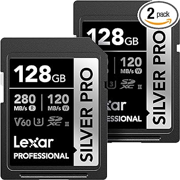 Lexar 128GB (2-PK) Professional SILVER PRO SD Card, UHS-II, C10, U3, V60, Full HD, 4K, Up To 280MB/s Read SDXC Memory Card, for Professional Photographer, Videographer, Enthusiast (LSDSIPR128G-B2NNU)