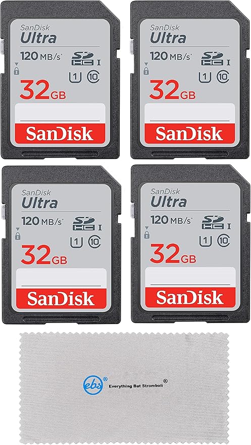 SanDisk 32GB Ultra SD Memory Card (4 Pack) SDHC UHS-I Card 120 MB/s Class 10 (SDSDUN4-032G-GN6IN) Bundle with (1) Everything But Stromboli Micro Fiber Cloth