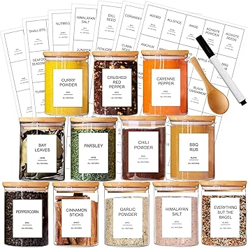 12 Pcs Glass Spice Jars with Bamboo Airtight Lids and 191 Labels - 8.5oz Small Food Storage Containers for Kitchen, Seasoning, Coffee, Herb - Spoon and Marker Included