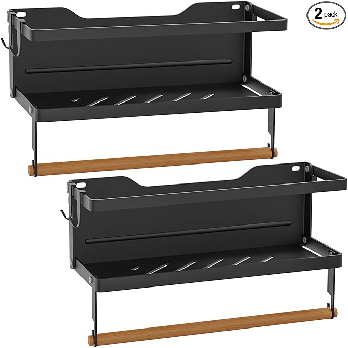 2 Pack Magnetic Spice Rack for Refrigerator, Moveable Spice Organizer with Paper Towel Holder & 4 Hooks, Foldable Magnetic Shelf for Fridge and Oven, Rustproof Seasoning Rack for Kitchen, Black