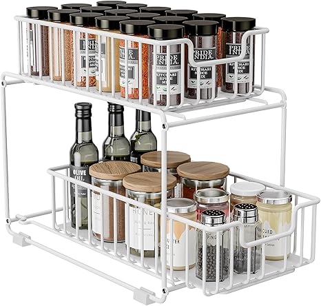 2 Tier Spice Rack and Pull-Out Basket Organizer for Under Kitchen Cabinet Sink Storage, White
