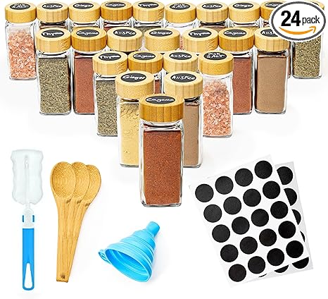24 Pack Glass Spice Jars with Bamboo Lids and Spoons, Complete Spice Containers with Labels Set, Includes Labels, Spice Shakers, 4 oz Glass Jar with Lid, Funnel, Kitchen Spices Set