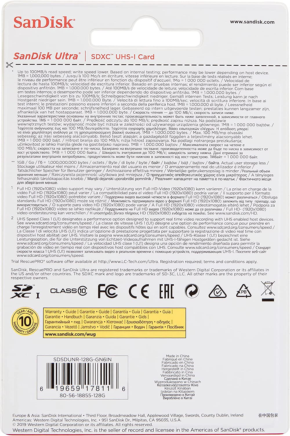 Take better pictures and Full HD videos(2) with your compact to mid-range point-and-shoot cameras and camcorders. With SanDisk Ultra UHS-I cards, you’ll benefit from faster downloads, high capacity and better performance to capture and store 32GB to 256GB(1) of high-quality pictures and Full HD video(2). Take advantage of ultra-fast read speeds of up to 100MB/s [64GB-256GB; 90MB/s for 32GB] to save time moving photos and videos from the card to your computer. SanDisk Ultra UHS-I cards(5) are water-proof, temperature-proof, X-ray proof, shockproof(4), compatible with SDHC and SDXC digital devices, and come with a 10-year limited warranty. Note: Not all devices support SDXC memory card formats. Check with your device manufacturer for more details. Up to 100MB/s[64GB-256GB; 90MB/s for 32GB] read speed; write speed lower. Based on internal testing; performance may be lower depending on host device, usage conditions, and other factors. 1MB=1,000,000 bytes. (1)1GB=1,000,000,000 bytes. Actual user storage less. (2) Full HD (1920x1080) video support may vary based upon host device, file attributes, and other factors. (3) See official SanDisk website for more details regarding warranty in your region. (4) Card only. See product packaging and official SanDisk website for additional information and limitations. (5) UHS Speed Class 1 (U1) designates a performance option designed to support real time video recording with UHS enabled host devices. See official SanDisk website for additional information and limitations. SanDisk, the SanDisk logo, and SanDisk Ultra are registered trademarks or trademarks of Western Digital Corporation or its affiliates in the US and/or other countries. The SD, SDHC, and SDXC marks and logos are trademarks of SD-3C, LLC. All other marks are the property of their respective owners. Copyright 2019 Western Digital Corporation or its affiliates. All rights reserved.