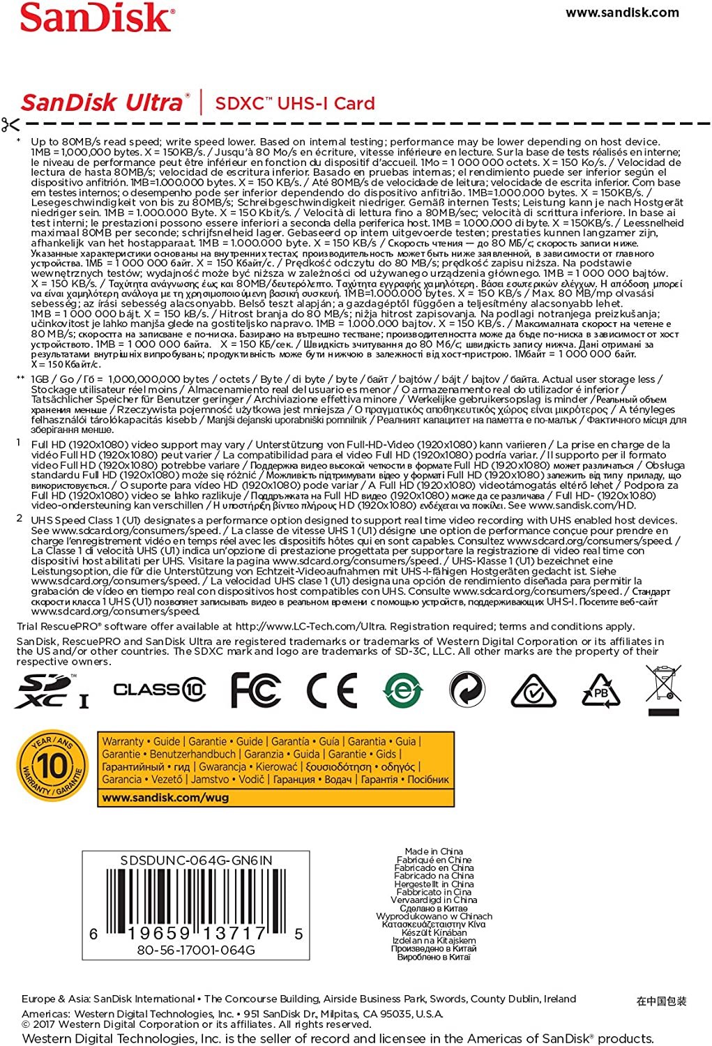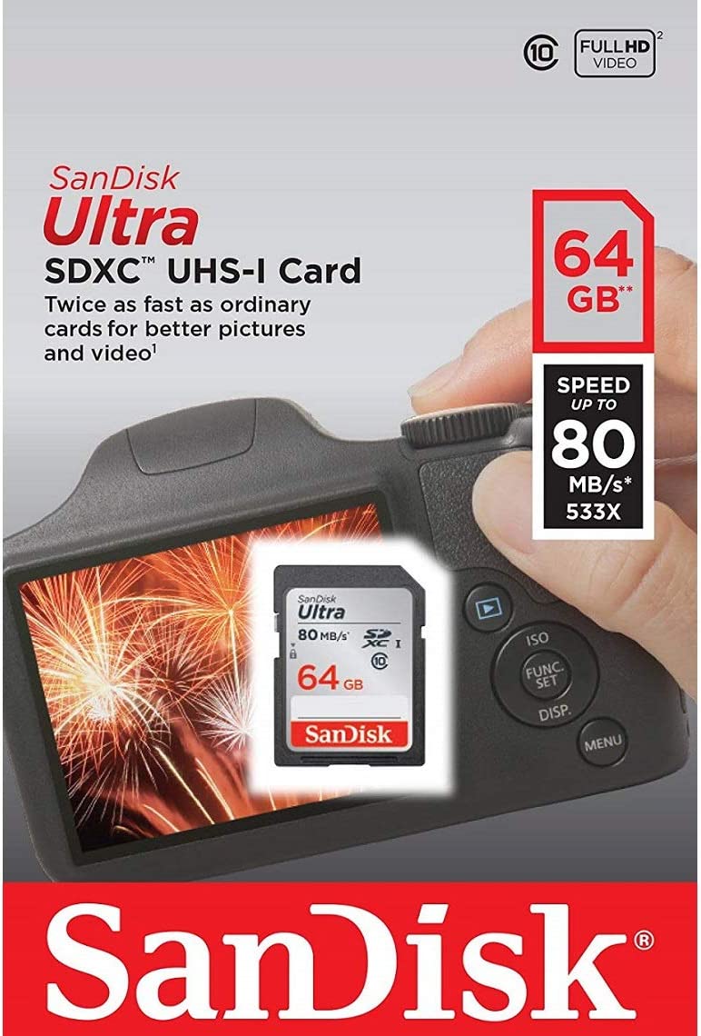 Twice as fast as ordinary SDHC and SDXC cards to take better pictures and Full HD videos with your compact to mid-range point and shoot cameras and camcorders. With SanDisk Ultra UHS-I cards you'll benefit from faster downloads, high capacity, and better performance to capture and store high quality pictures and Full HD video. Take advantage of ultra-fast read speeds of up to 80MB/s to save time moving photos and videos from the card to your computer. SanDisk Ultra UHS-I cards are water proof, temperature proof, X-ray proof, shock proof, compatible with SDHC and SDXC digital devices..