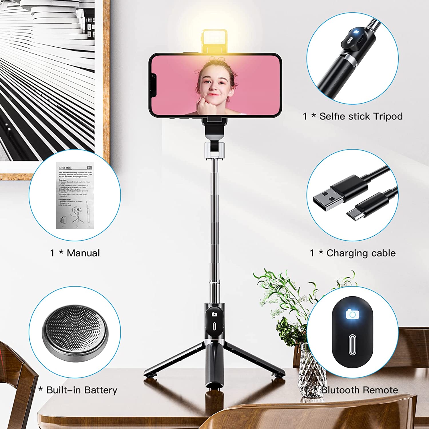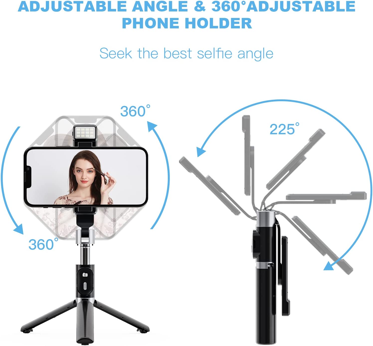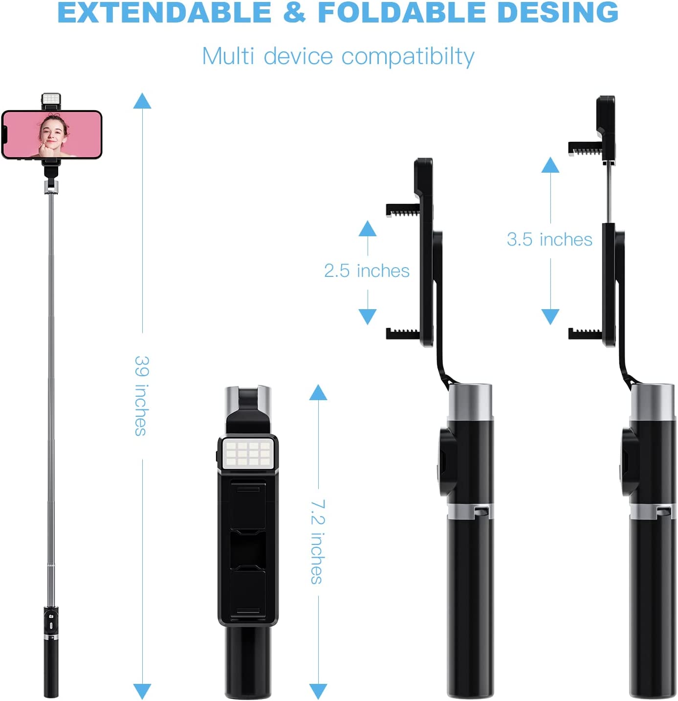 • 😍【Lightweight & Foldable Selfie Stick for Phone】: Compact and lightweight design, iphone tripod only 4.9oz weight, 7.2'' folded size & up to 39'' extension length.You can put it in pockets or travel bags. It is portable to take everywhere and is an indispensable shooting accessory, like travel and outdoor sports, to record different wonderful moments for you.