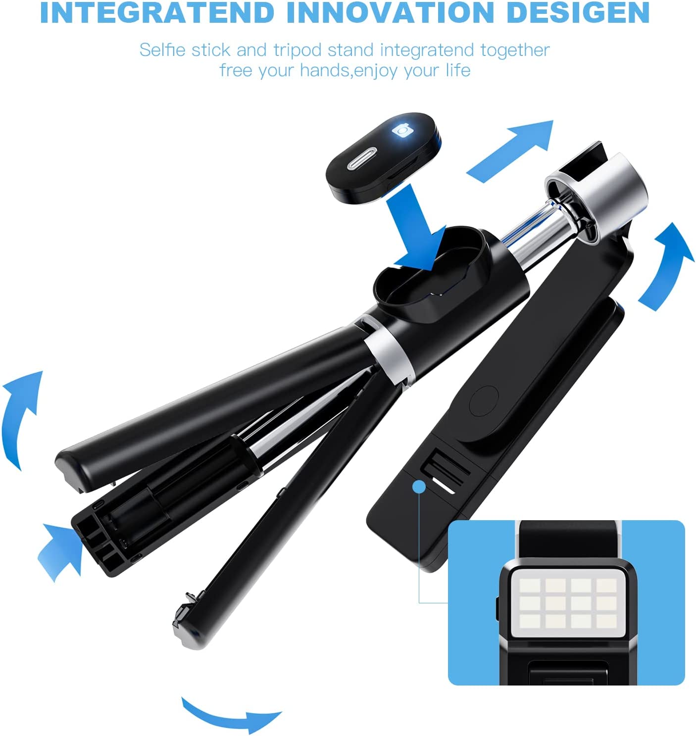 ACEHE Selfie Stick Tripod, 2 Level Fill Light & All in 1 Portable Bluetooth Selfie Stick Tripod with Remote Phone Tripod Stand, Cell Phone Tripod for iPhone 13/12/11/XR/X/8/7,Android Smartphone -Black