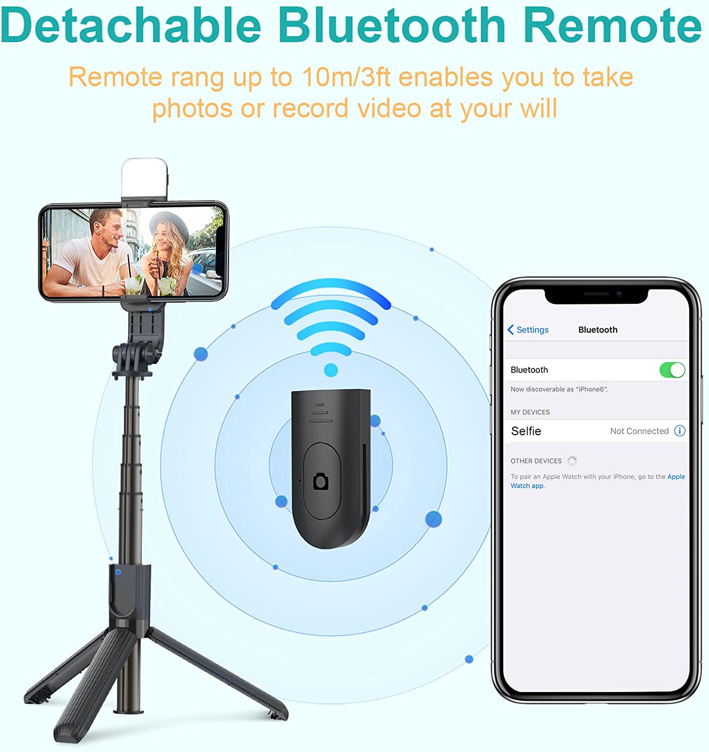• 【Detachable Bluetooth Remote Control】Comes with a pocket-sized detachable bluetooth remote that allows for battery replacement. Bluetooth selfie stick supports a long distance of 10m, without the help of others, you just need to press the button to take beautiful photos.