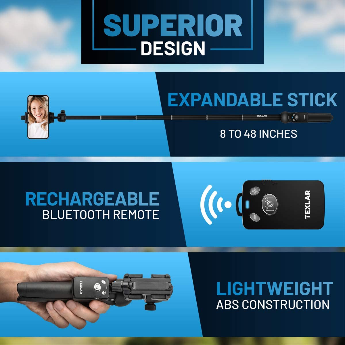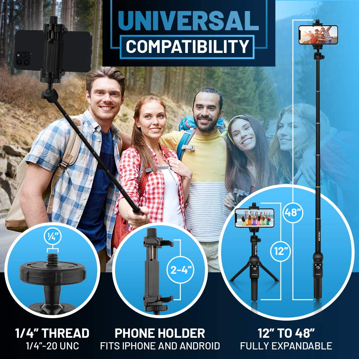 • Two-In-One Selfie Stick and Tripod - The TS48 Pro features a fully expandable handheld selfie stick handle with built-in collapsible legs that allow it to double as a stand-alone tripod when opened. The stick extends from 8" to 48", so you can capture a variety of angles that other selfie sticks cannot.