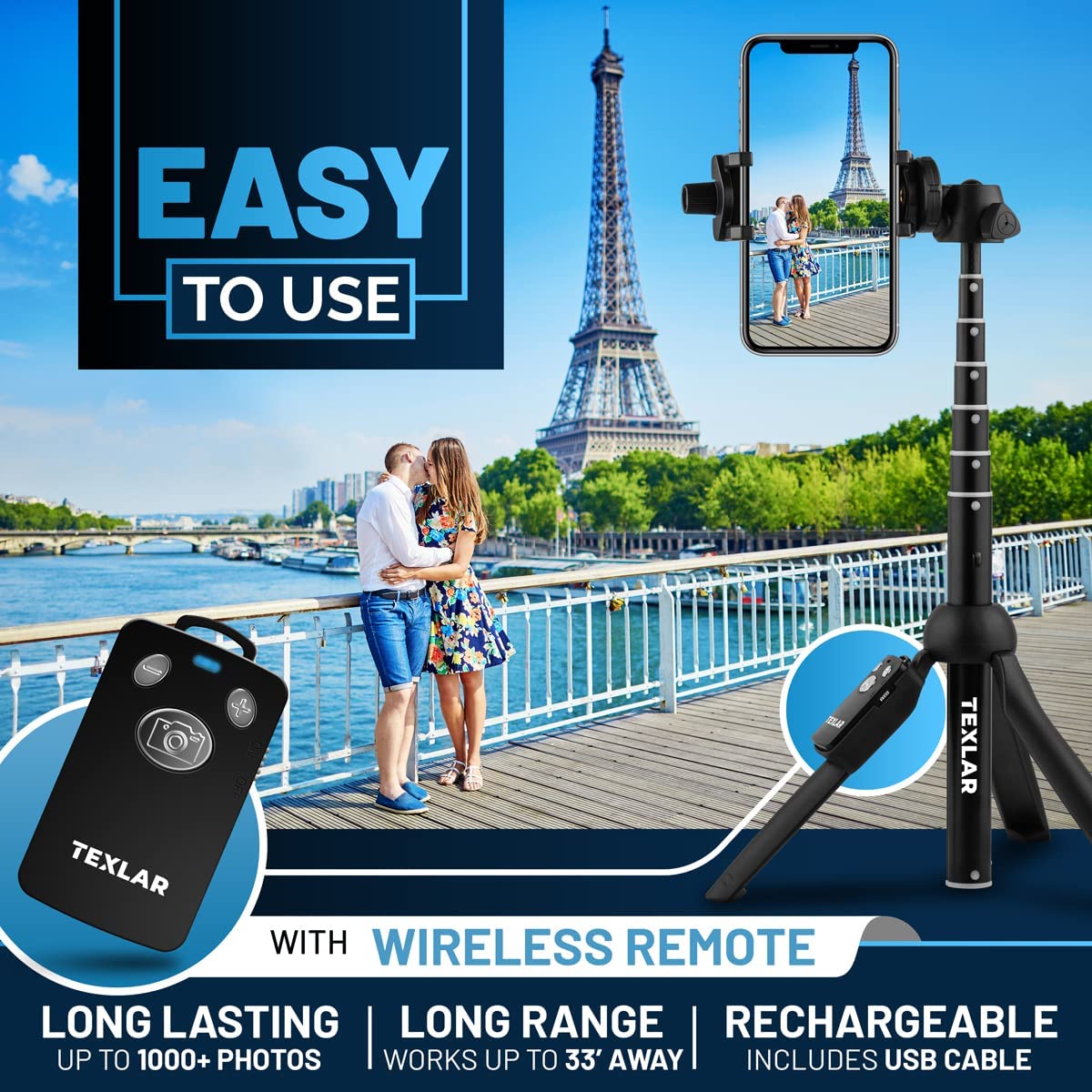 • Integrated Wireless Bluetooth Remote - This photography accessory conveniently includes an integrated rechargeable and detachable wireless shutter remote that works up to 33 feet away. The long-lasting battery can take up to 1,000+ photos, and can be charged when needed using the included USB cable. (Remote zoom function is only compatible on Android.)