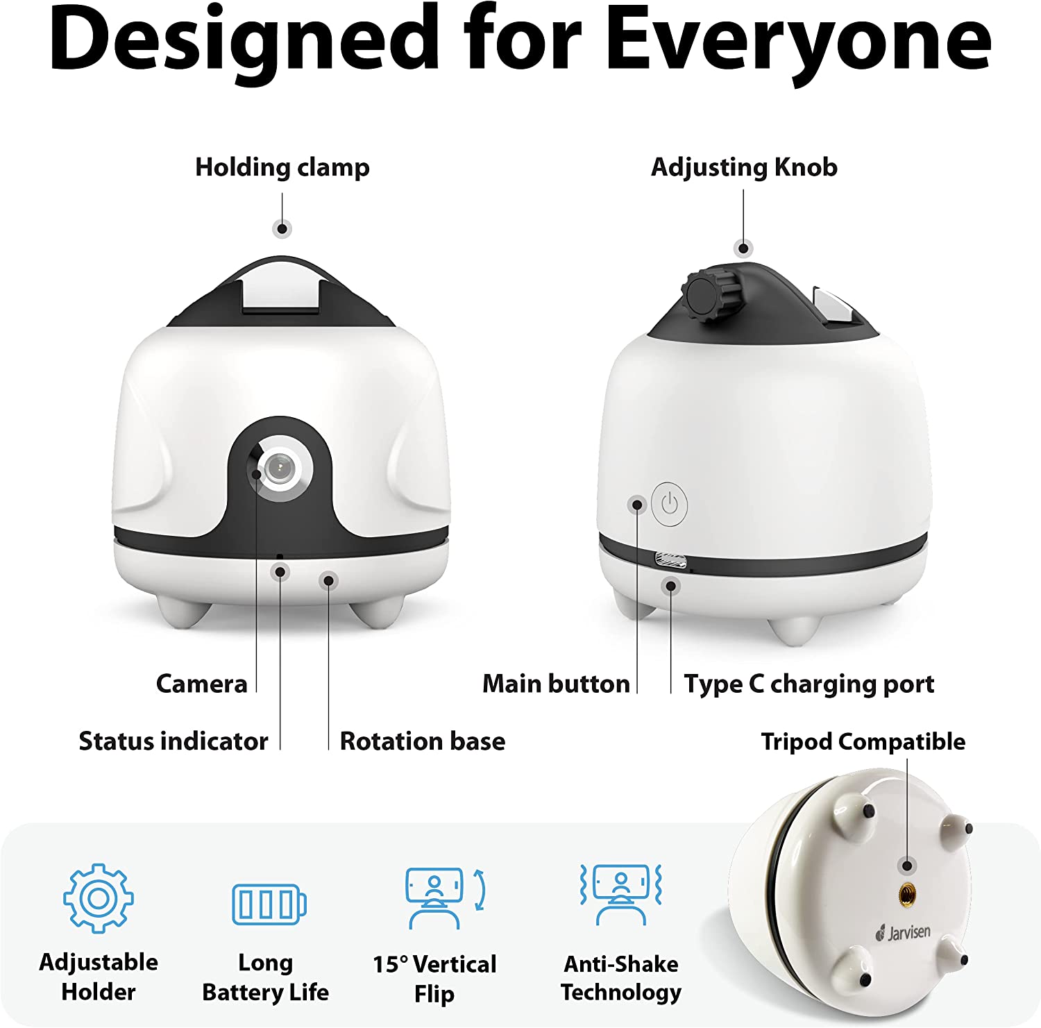• 💘Your Personal Pod: Simply turn auto face tracking tripod on, and phone tripod stand and follows your face and body movement. With the Jarvisen auto tracking phone holder, you are always focused in the frame. It can rotate 360°infinitely with ultra-fast response and gives the totally hands-free experience.