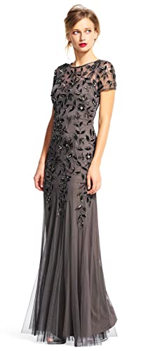 Details: This is a beaded gown with godets, illusion neckline and elbow sleeve