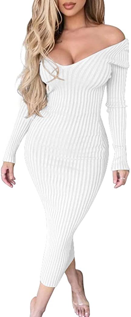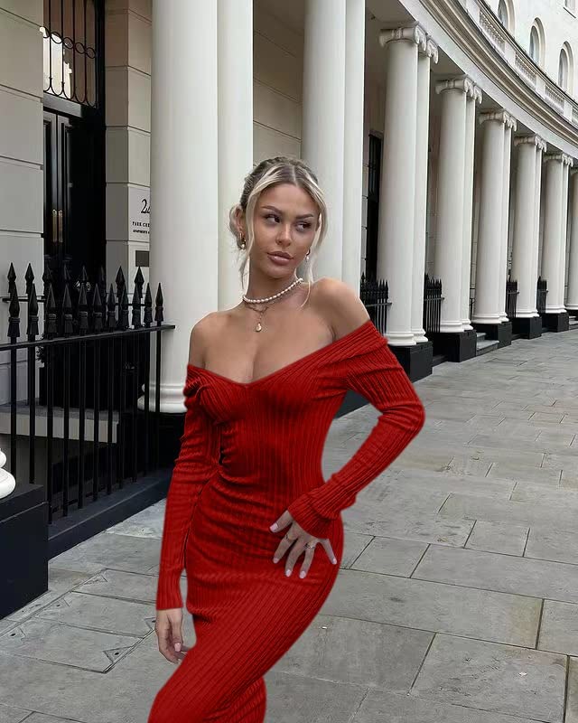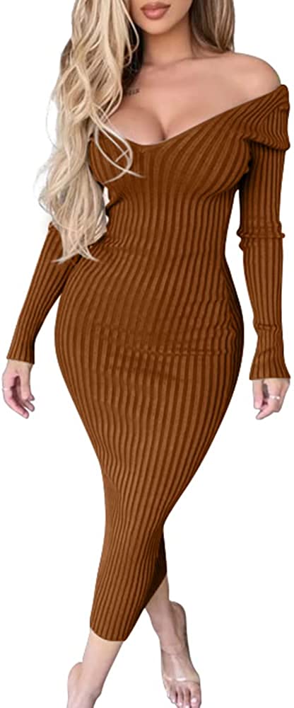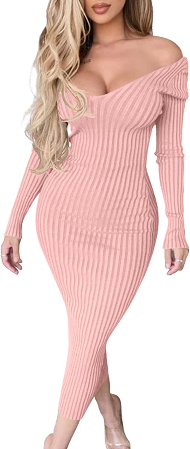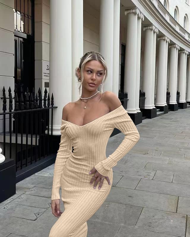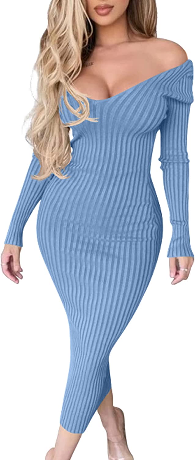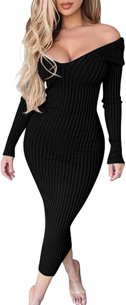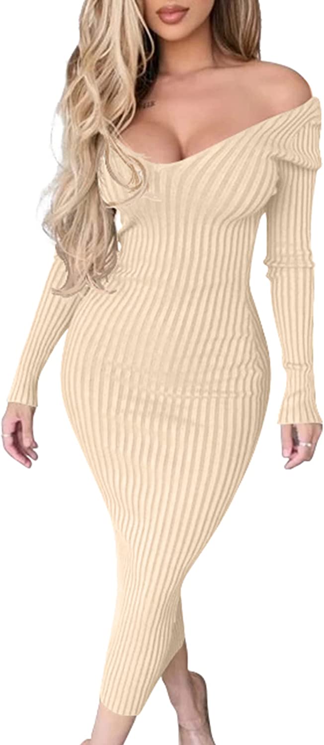 BEAGIMEG Women's Sexy Long Sleeve Off Shoulder Knit Bodycon Long Dress