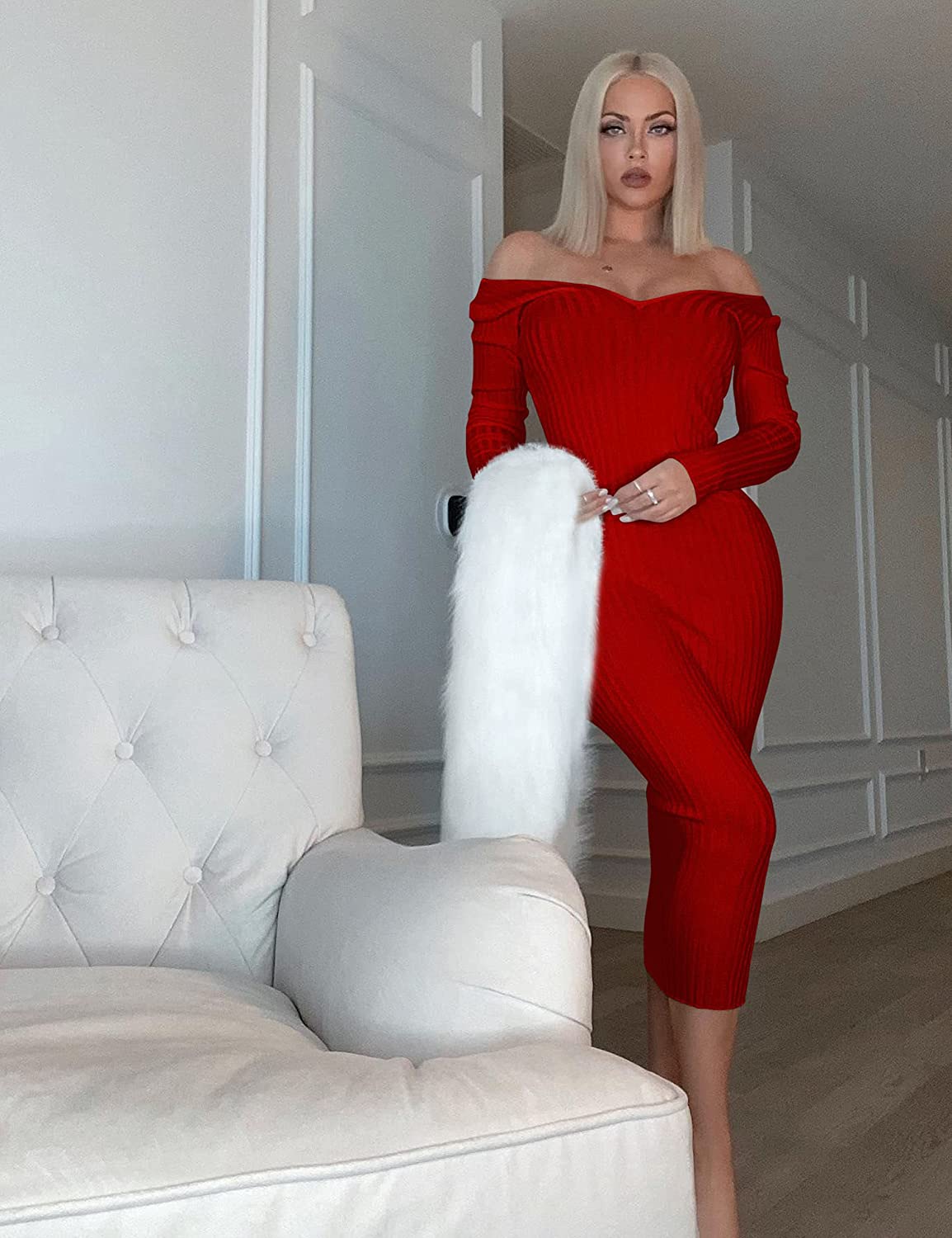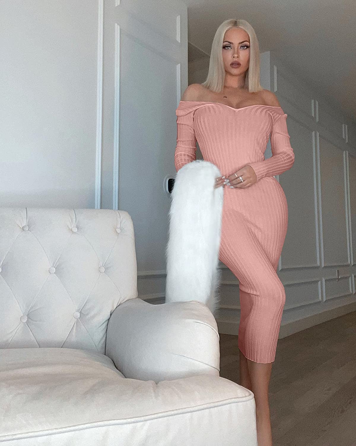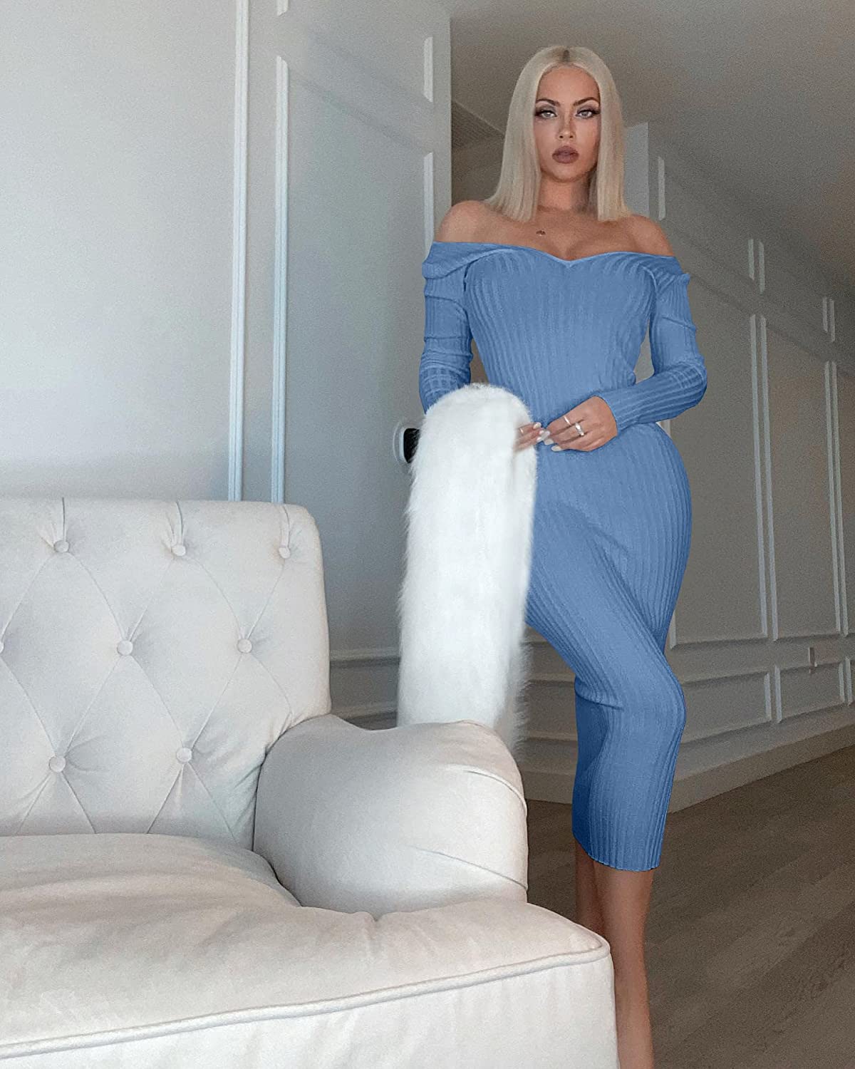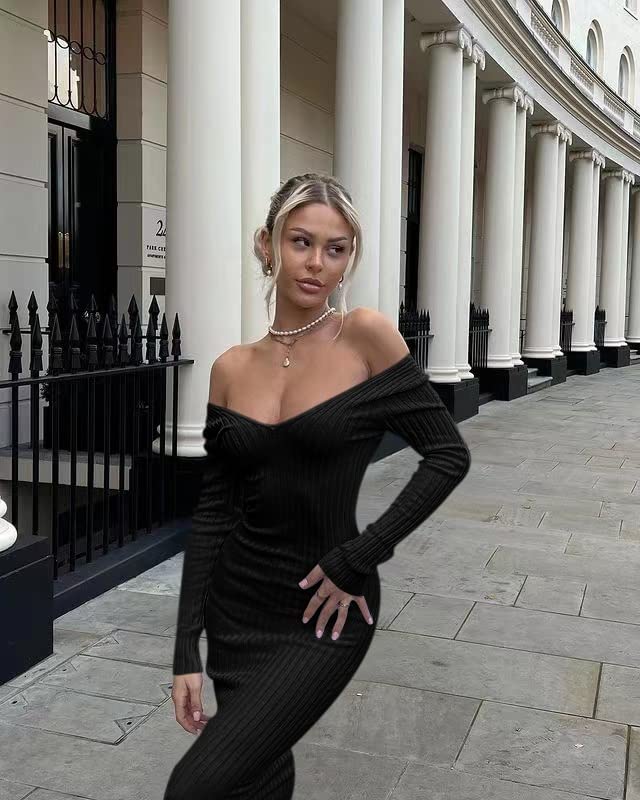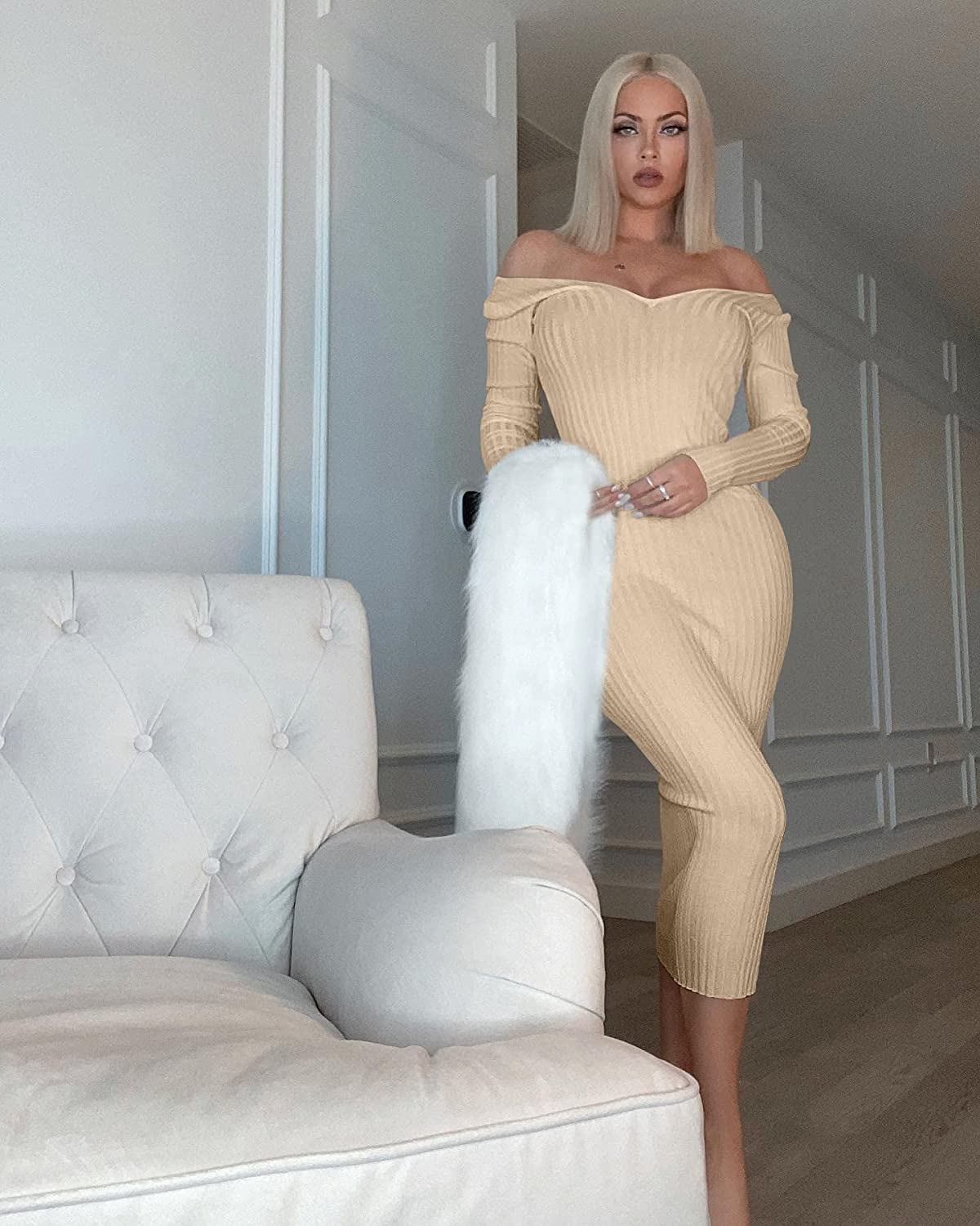 BEAGIMEG Women's Sexy Long Sleeve Off Shoulder Knit Bodycon Long Dress