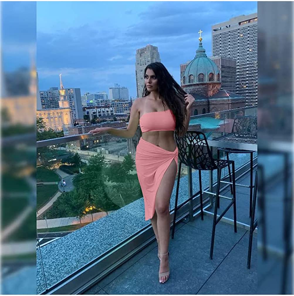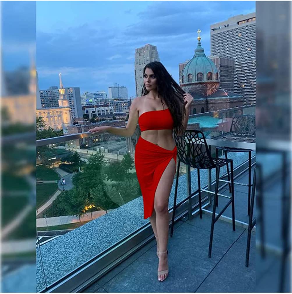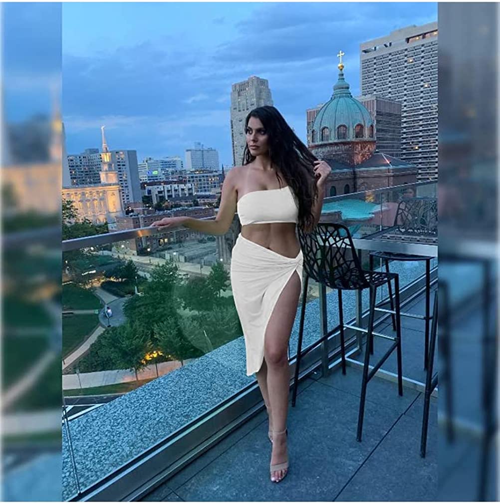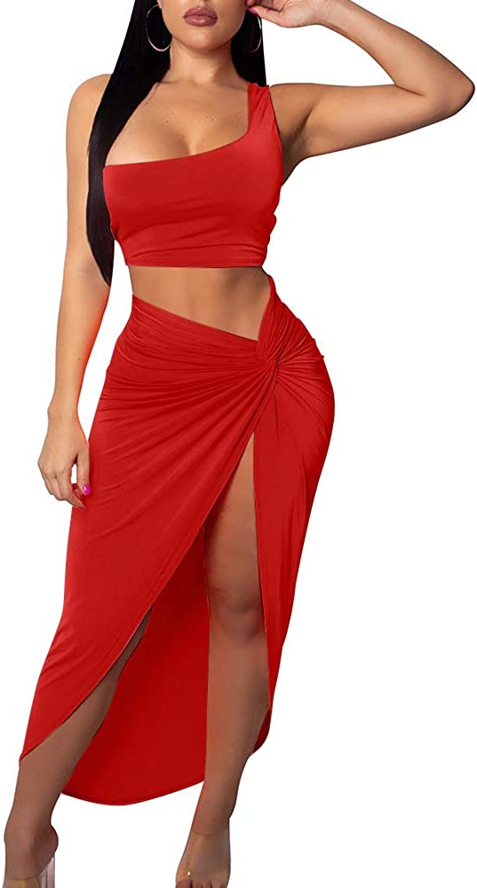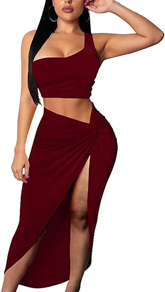 BEAGIMEG Women's Sexy One Shoulder Long Bodycon Slit Skirt 2 Pieces Dress