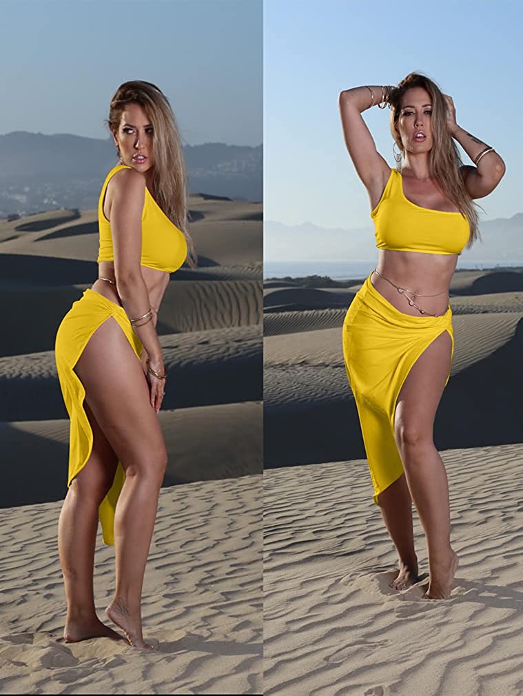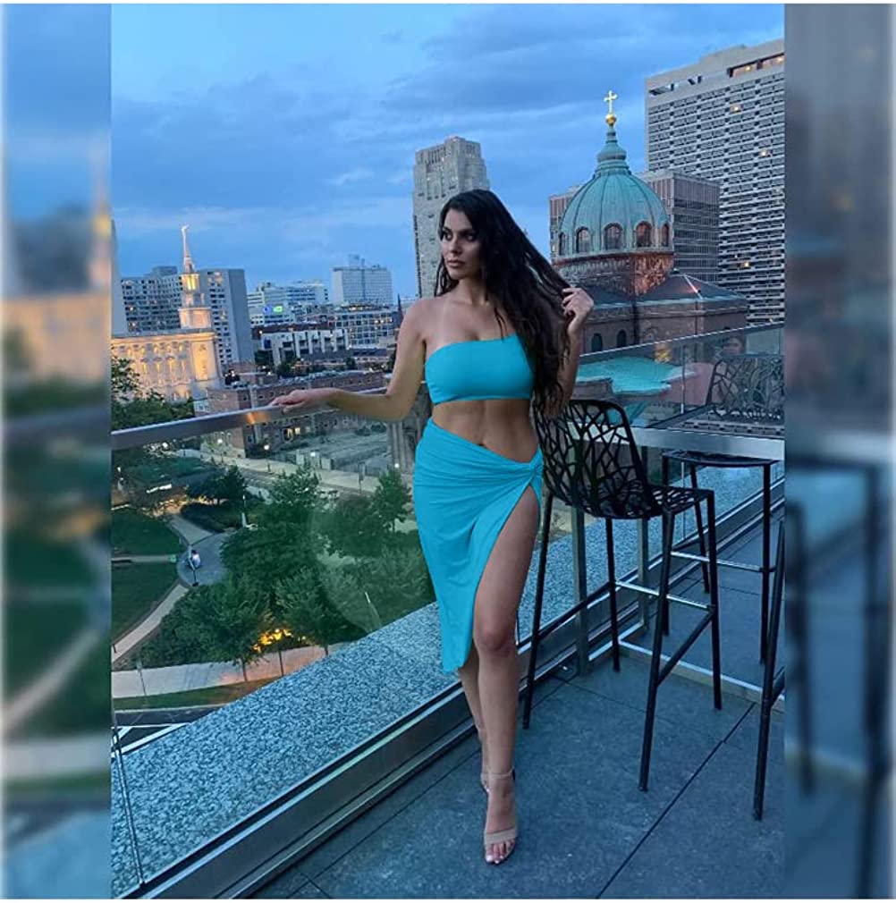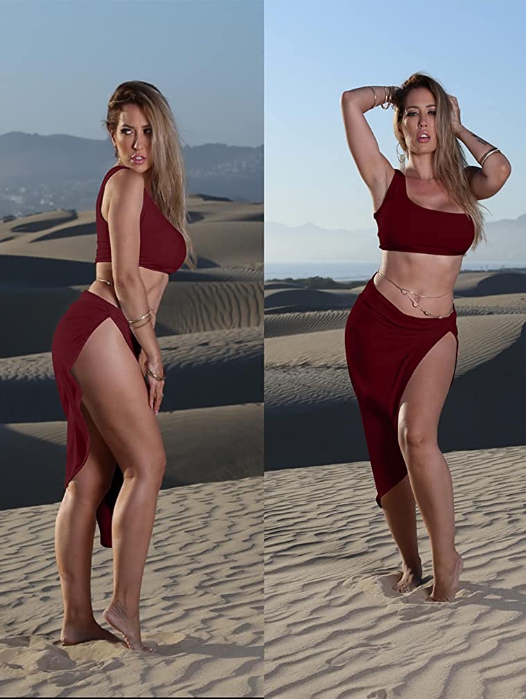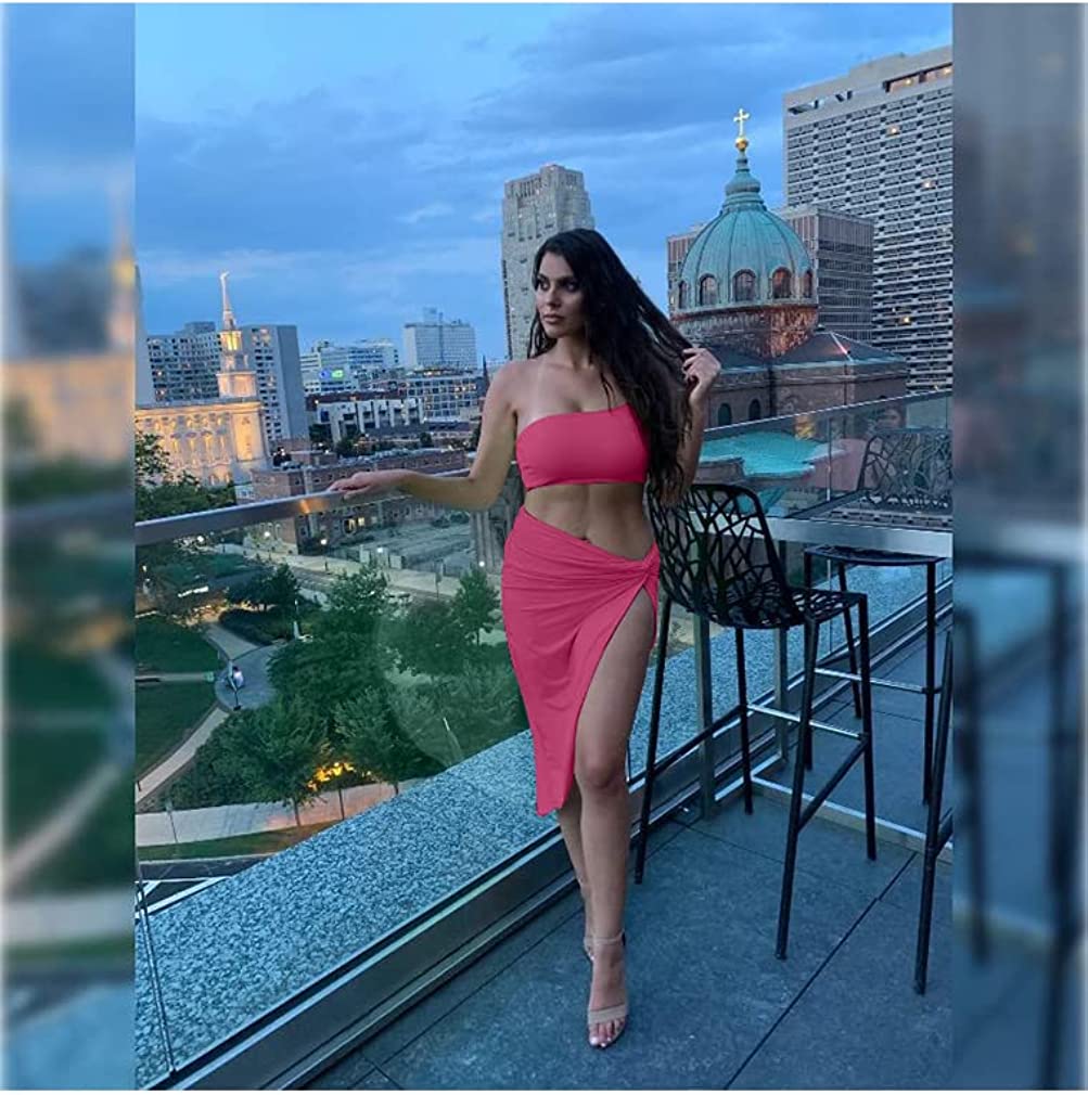 BEAGIMEG Women's Sexy One Shoulder Long Bodycon Slit Skirt 2 Pieces Dress