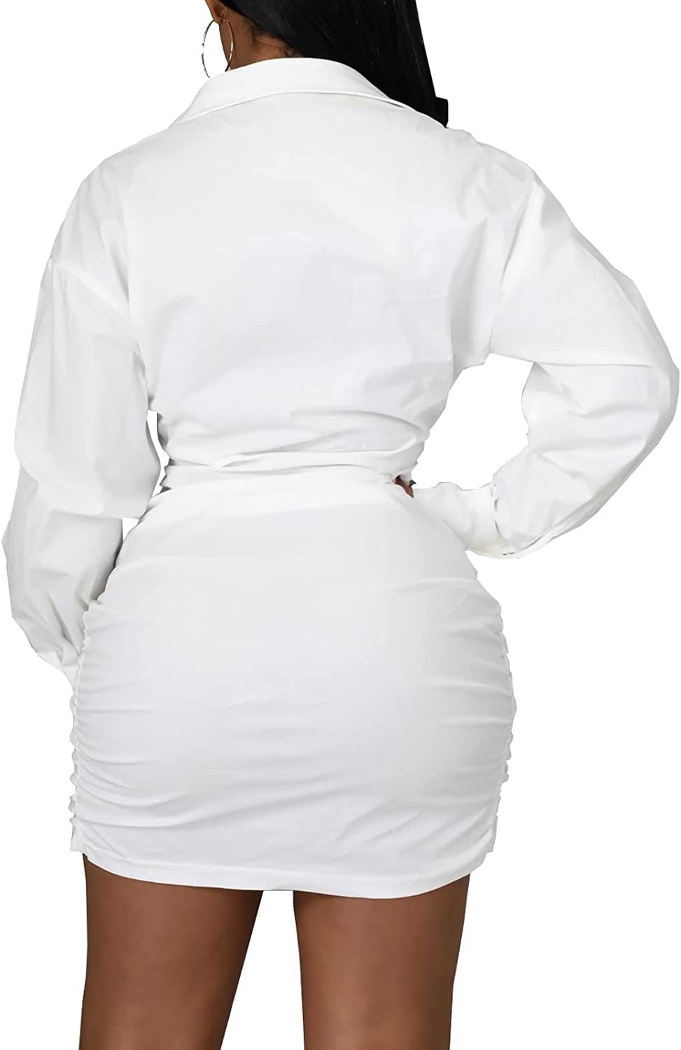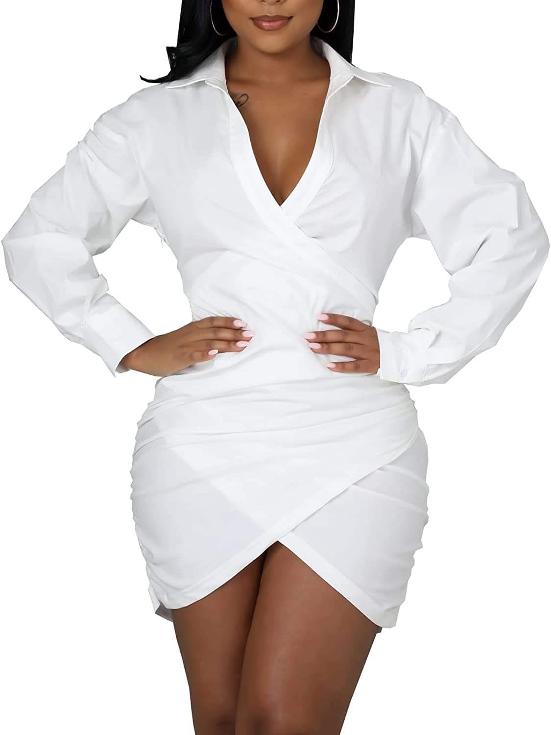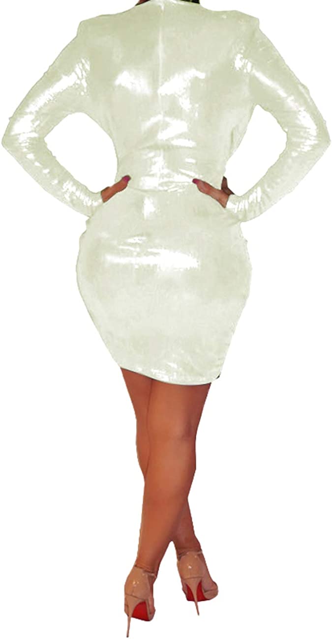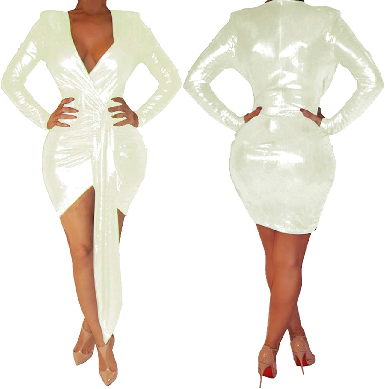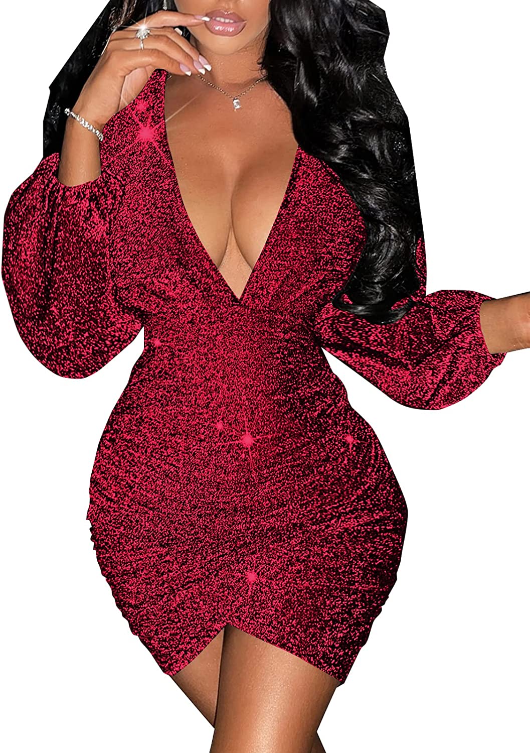BestGirl Women's Sexy Dress Deep V Neck Long Sleeve Ruched Sparkly Bodycon Club Mini Dresses