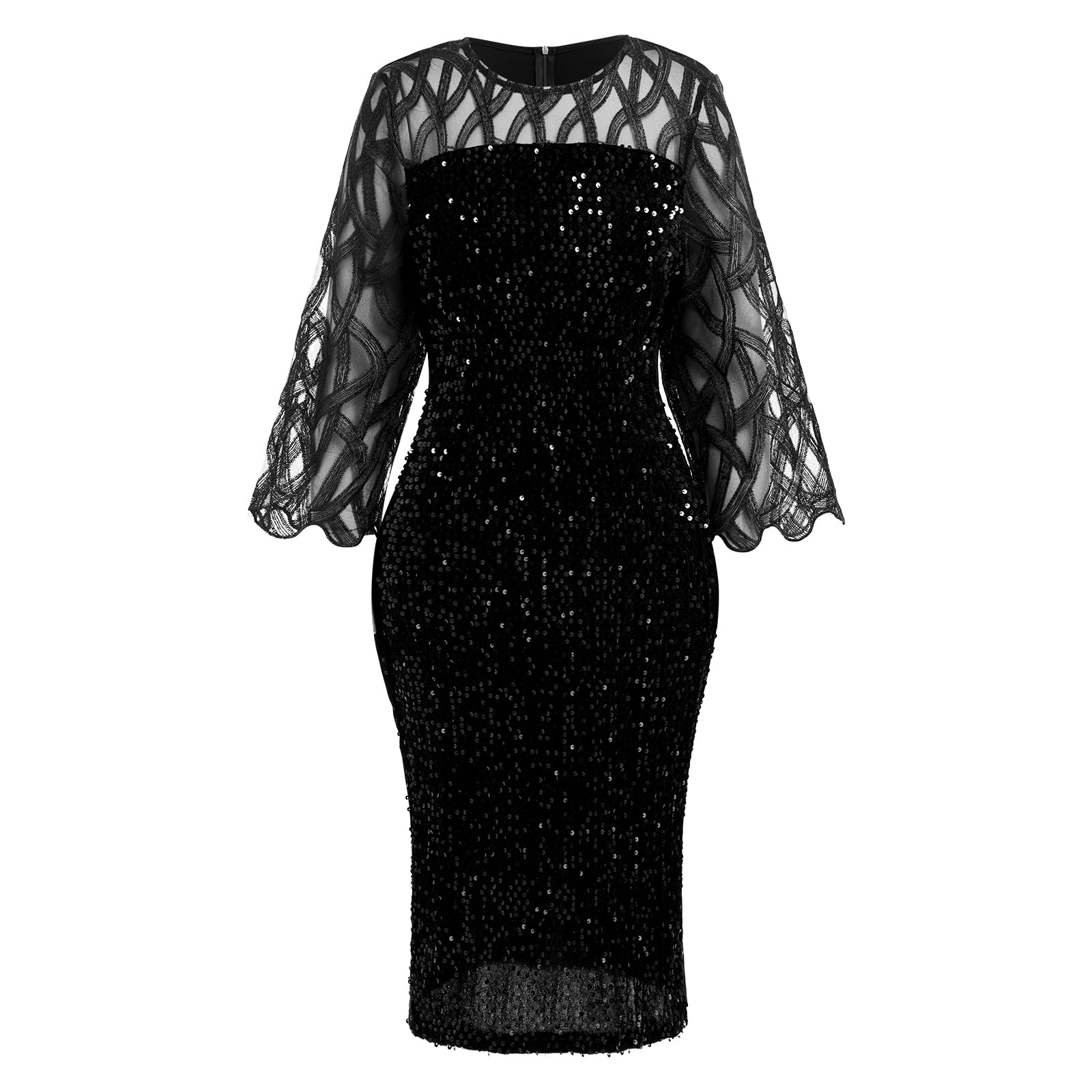 Black Sequin Party Dress Plus Size Long Sleeve Slim Fit Mesh Bodycon Dress Midi Length Womens Elegant Evening Wedding Guest Cocktail Homecoming Party Gown Fall Clothes Black XXXL
