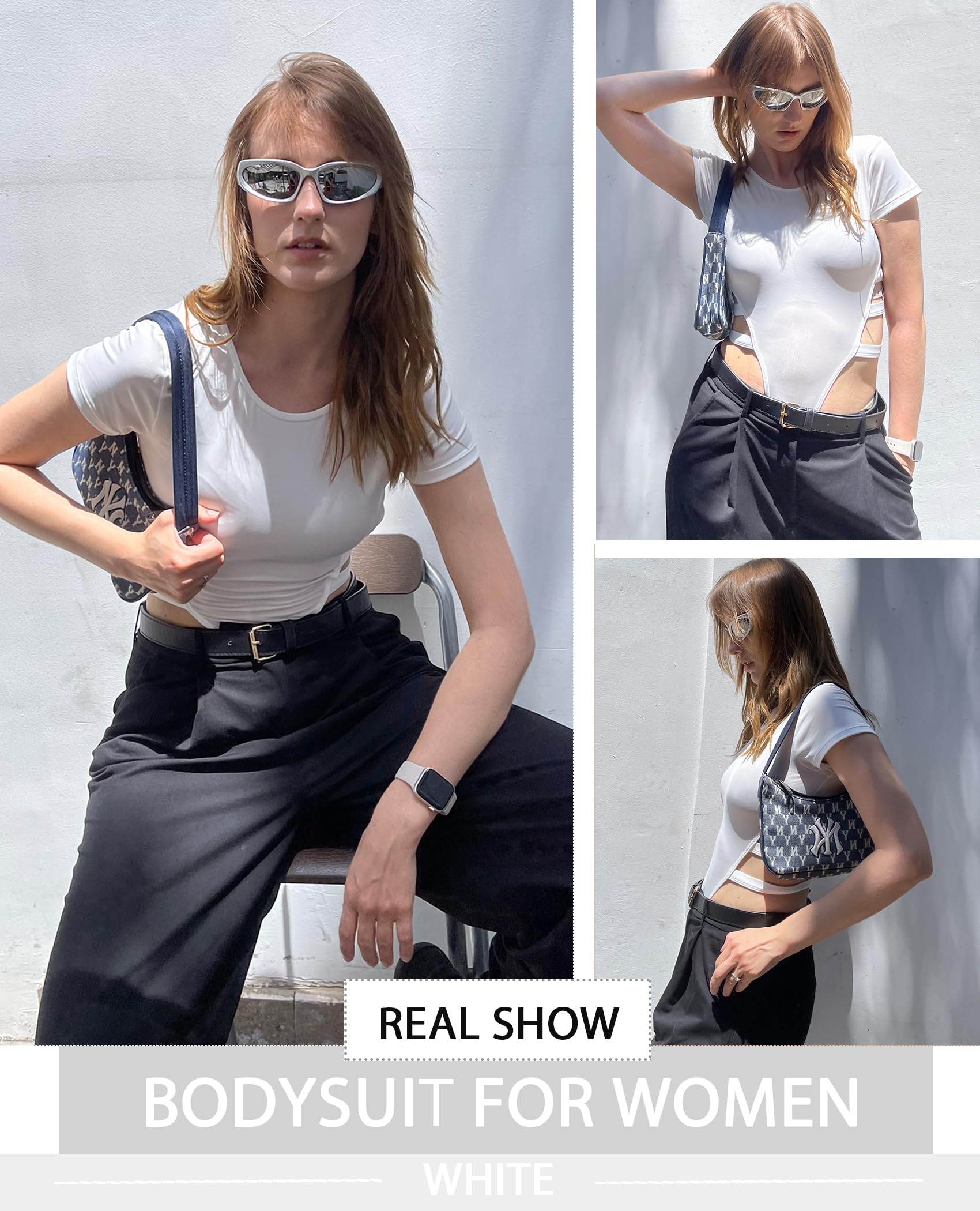 Avidlove Women's Crew Neck Short Sleeve Bodysuit Solid T Shirts Cut Out Bodysuits Summer Tops(White,M)