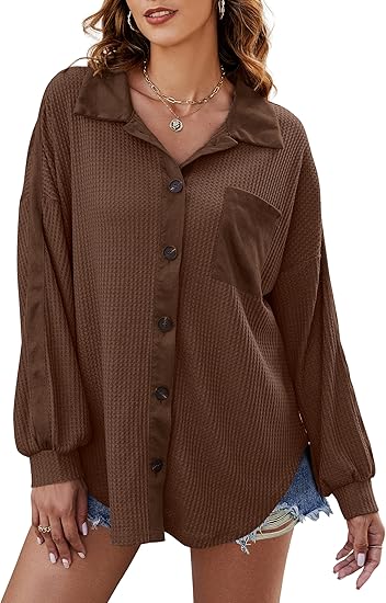 Blooming Jelly Womens Waffle Knit Shacket Jacket Long Sleeve Button Down Shirts Dressy Blouses Tops