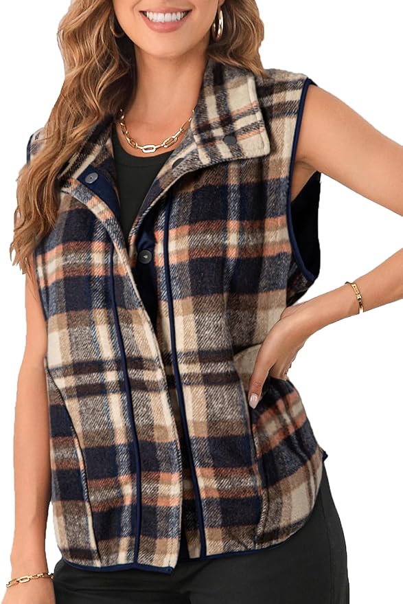 Dokotoo Womens Plaid Vest Lapel Button-Down Sleeveless Flannel Shirts Casual Oversized Tunic Shacket Jacket