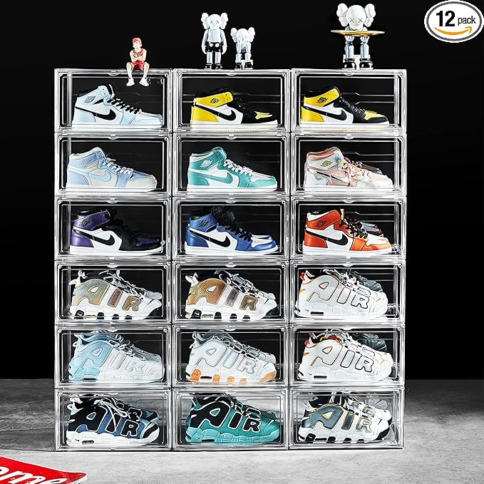 12 Pack Shoe Boxes, Clear Acrylic Stackable Plastic Sneaker Box Container, Magnetic Drop & Side Open Shoe Organizer Case Container With Lids Fits Up to Size 14 (Crystal Clear)
