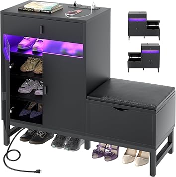 armocity Shoe Cabinet Storage for Entryway - Freestanding Shoe Rack Bench with LED Lights & Power Outlets, Reversible Shoe Storage Cabinet Organizer with Drawer and Hidden Compartment, Black