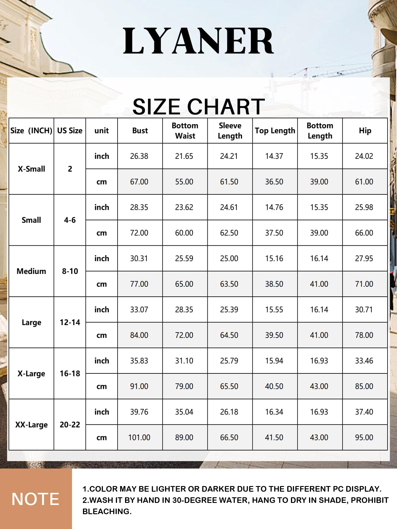 Small: Bust: 72-82 cm/28.25-32.25", Clothing Length: 34 cm/13.5", Sleeve: 58 cm/22.75", Shoulder: 34 cm/13.5", Waist: 61-71 cm/24-28", Hip: 69-79 cm/27.25-31", Skirt Length: 35.5 cm/14",