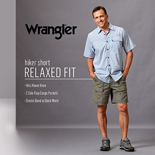 Details: Wrangler Authentics Men's Canvas Utility Hiker Short. Made with pure cotton fabric, these men's shorts are ready for a hike. A relaxed fit and look from the Wrangler name you trust. FEATURES: Durable cotton fabric. (2) Cargo flap pockets, (2) back Velcro pockets and (2) slash pockets. Relaxed fit through the seat and thigh. Sits at the natural waist for a comfortable fit. 8" inseam.