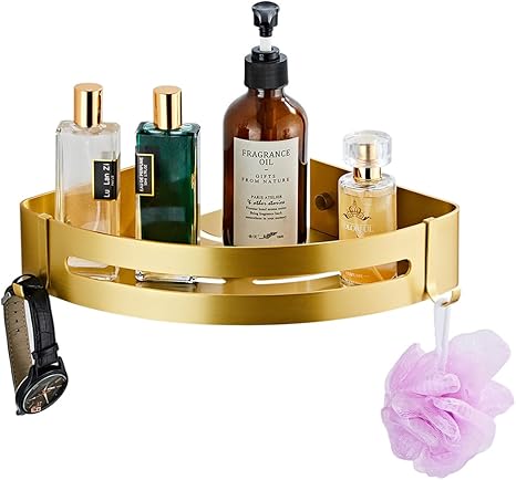 Brushed Gold Bathroom Corner Shelf Wall Mount Shower Organizer Shampoo Holder with Hooks, Adhesive or Drilling