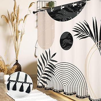 72"X72" Boho Mid Century Black and White Shower Curtain Sets with Tassel Pendants Arch Sun Modern Minimalistic Leaves Bathroom Curtains Waterproof Ployester 12 Hooks Home Decorations