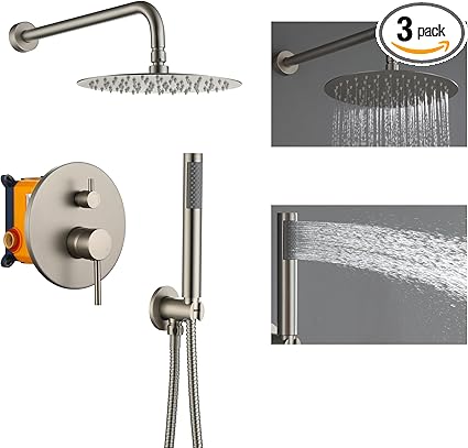 10 Inch Shower Faucet Set Brushed Nickle Round Shower System Luxury Rainfall Shower Head with Handheld Combo - Pressure Balance Valve