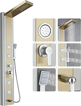 55 in. 4-Jet Stainless Steel Brushed Gold Shower Panel System Fixed Rainfall Shower Head, Tub Spout & Handheld Shower, Jet Massage