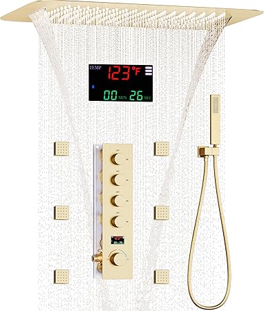 AYIVG Brushed Gold Thermostatic Shower System 16X24 inch Rainfall And Waterfall Shower System Set Ceiling Full Body Shower System with Handheld Spray and Digital Display Pressure Balance Valve