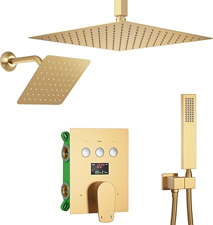 Brushed Gold Shower Faucet System with 12inch & 8inch Rainfall Shower Head Luxury Temperature Digital Display Shower Faucet Set Shower Fixtures Combo Set, Can Use at The Same Time