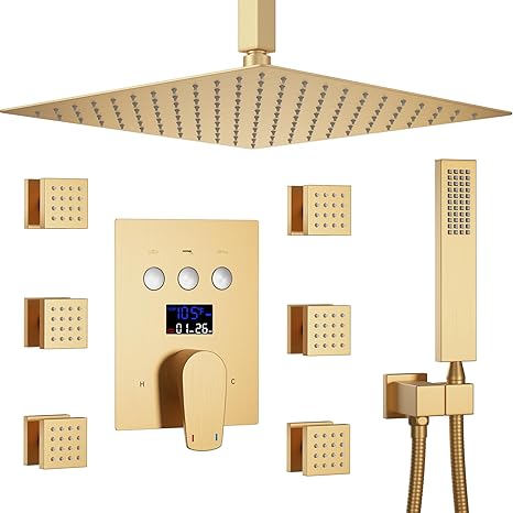 Brushed Gold Shower System 12 Inch Top Shower Head with Body Jet and Handheld, Ceiling Mounted Bathroom Shower Faucet Set Temperature Display Shower System