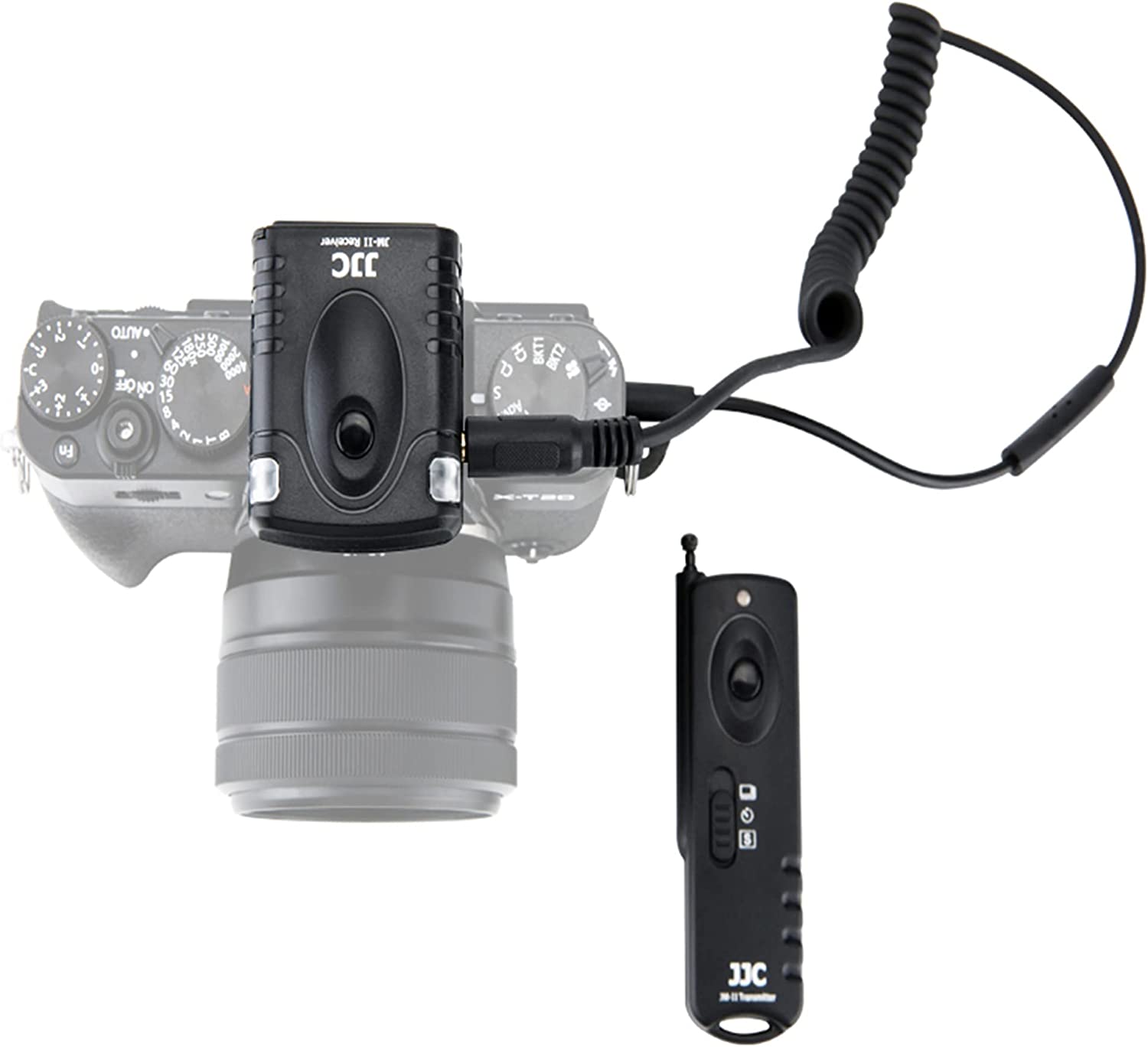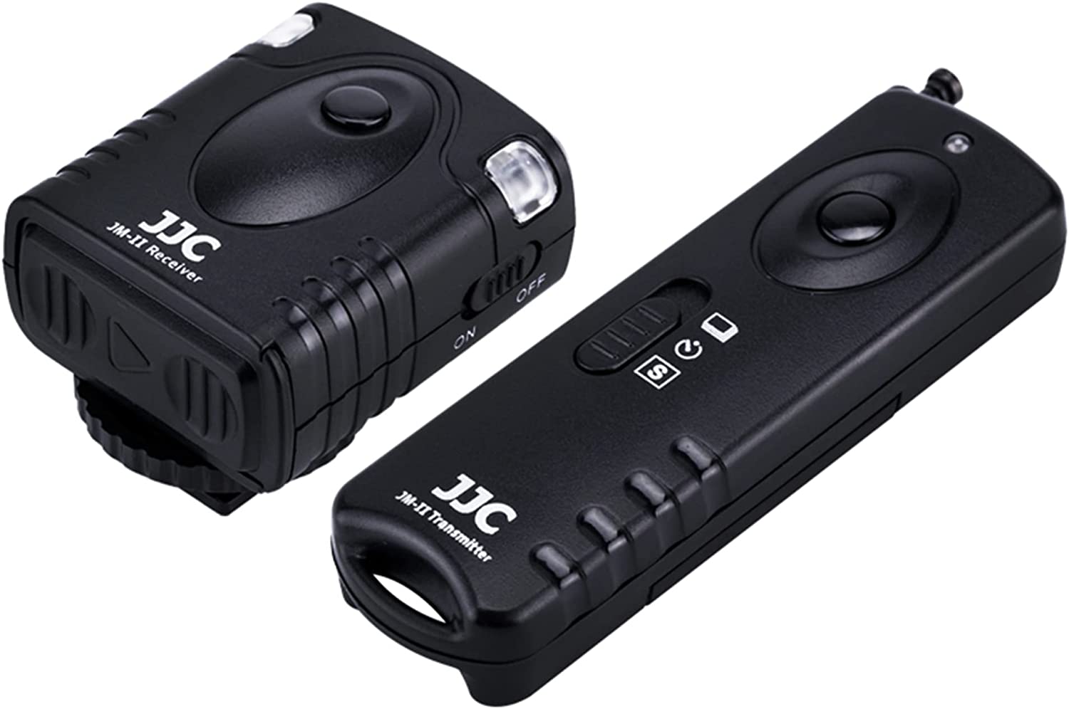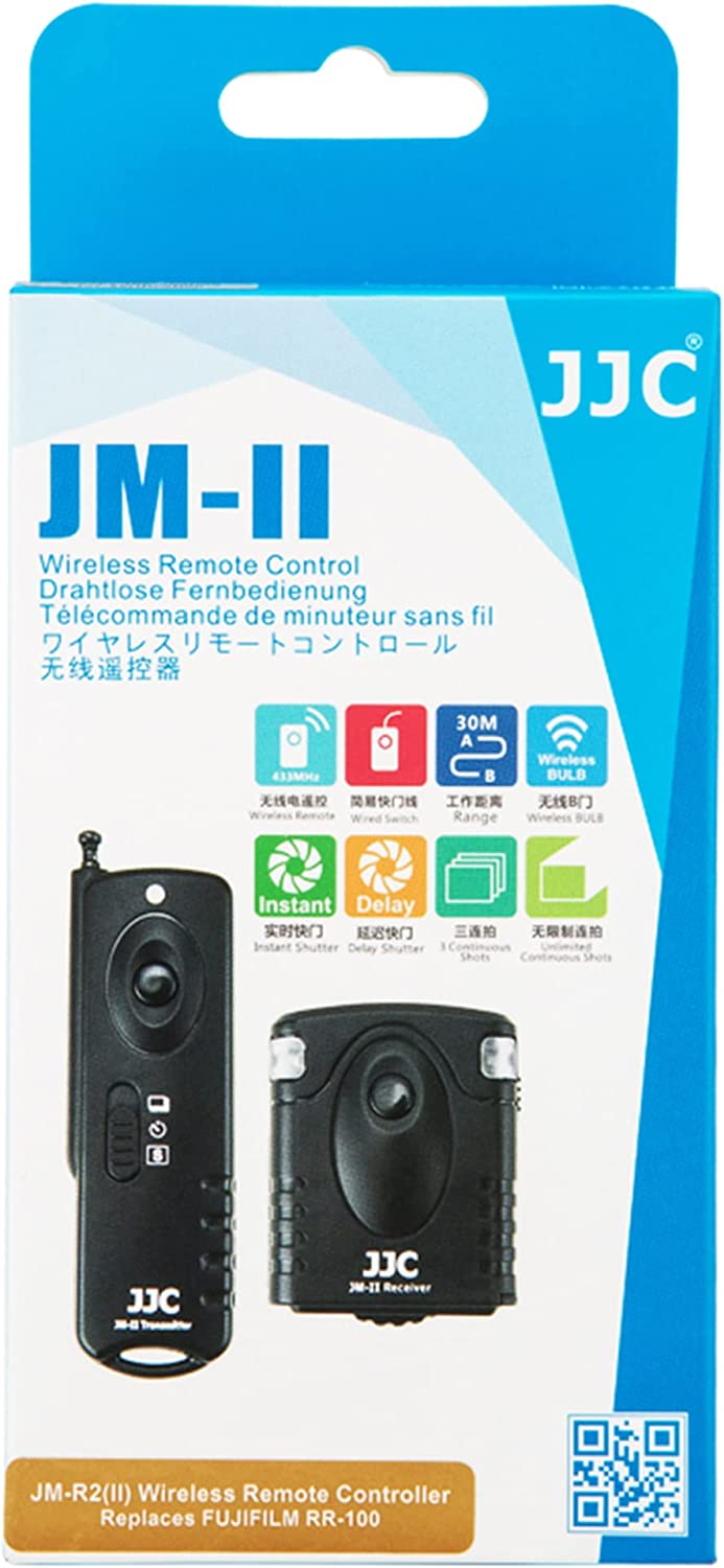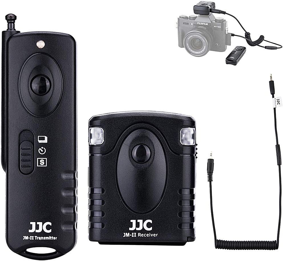 JJC JM-II series Radio Frequency Wireless Shutter is designed for most DSLR and SLR cameras that have a remote socket on the camera body. The system works at 433MHZ frequency and has 16 available channels. What’s more, this wireless remote system allows the transmitter to trigger the receiver from 30 meters away. The JM-II receiver simply attaches to a compatible camera's accessory shoe, and then just connects the supplied JJC receiver cable to the camera's remote socket. The receiver is powered by one piece of CR-2 lithium battery while the transmitter is powered by one piece of 23A battery. JM-II transmitter can trigger the camera shutter at five modes: single shot, 5 seconds delay shot, 3 continuous shots, unlimited continuous shots and bulb shot. The receiver has a 1/4"-20 tripod mount socket on the bottom, so you can even mount the receiver onto a tripod. Most importantly, our JM-II transmitter is able to fire multiple receivers at the same time. The receiver itself with the connecting cable can be used as a Wired Remote Switch, then half press to focus, full press to take a photo. All these features make it good for eliminating camera shake in long exposure photography.