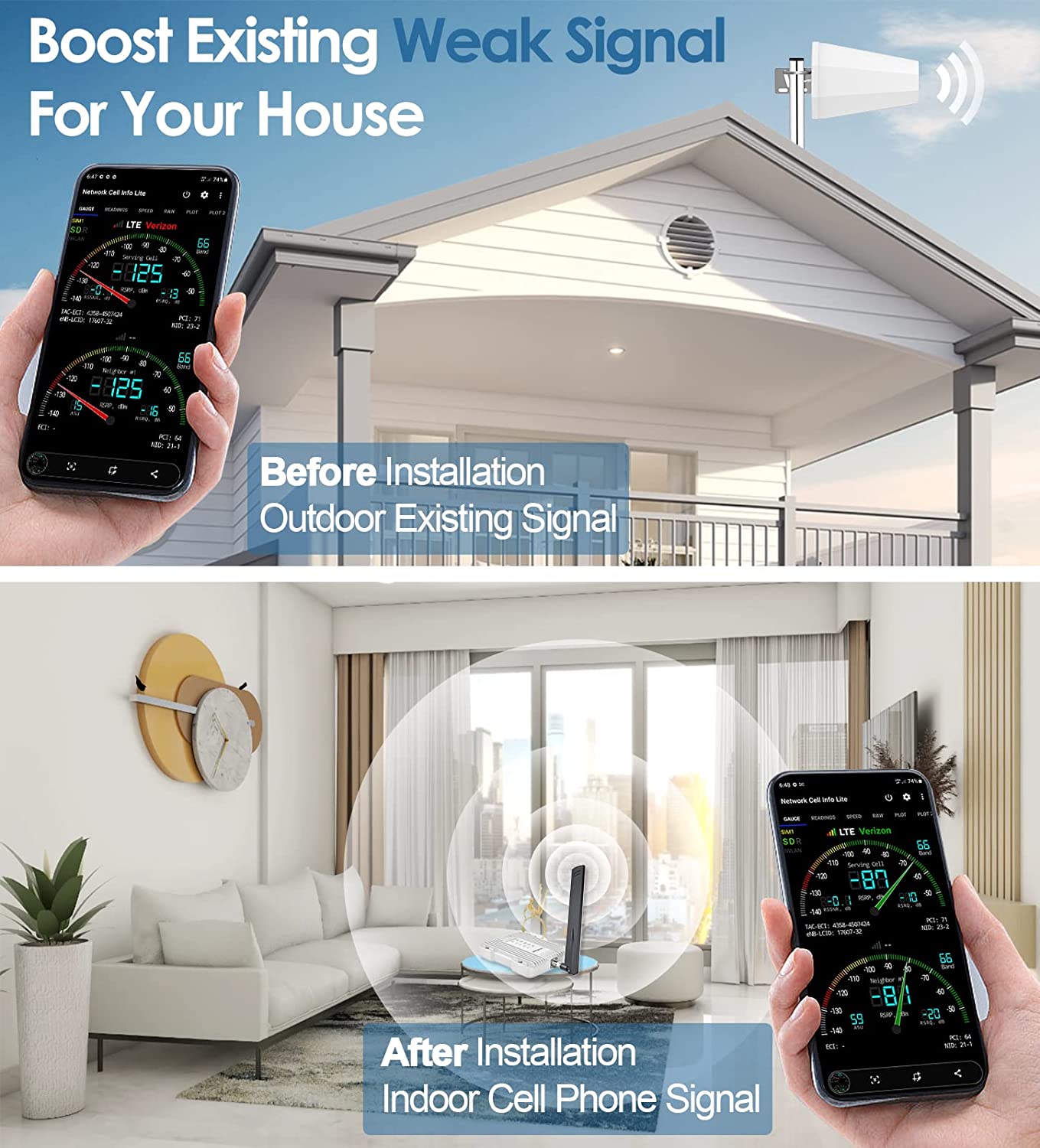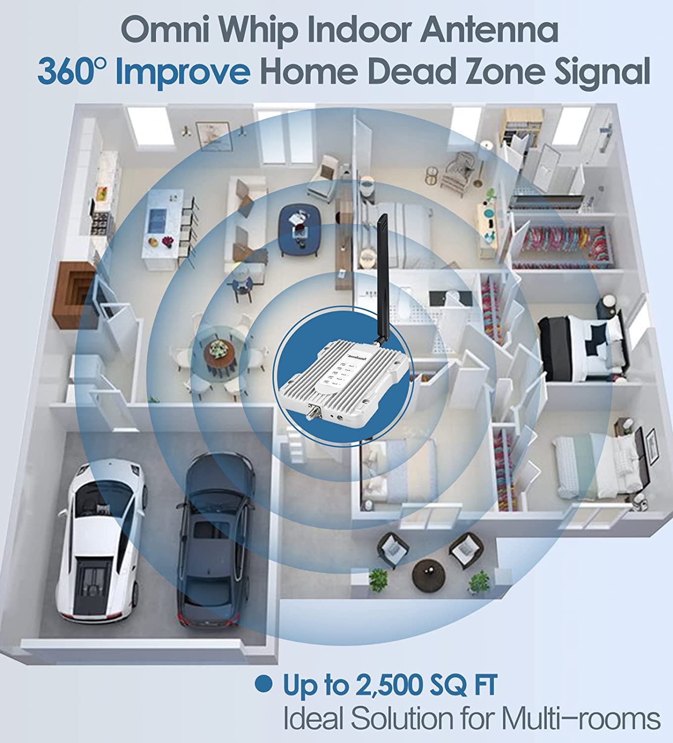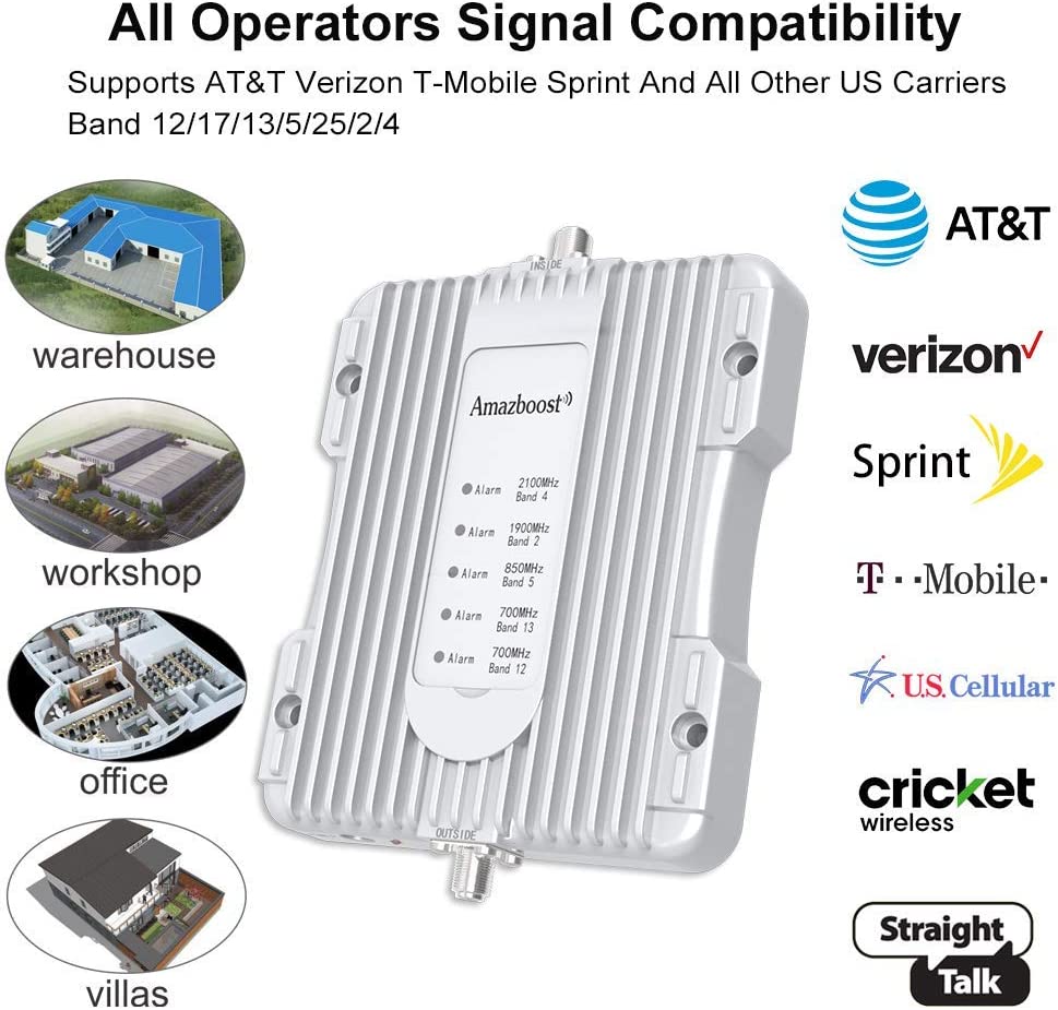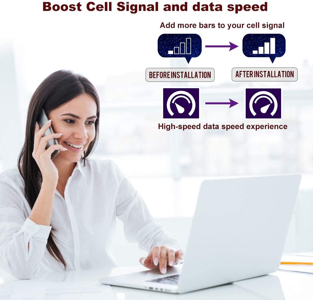 • Boosts Voice Signal: Enhances the signal up to 100X, with a coverage area of 2500 sq. Ft. allowing everyone to enjoy fewer dropped calls, better voice quality, and faster data speeds within its coverage area.(Note: coverage area range depends on the outdoor signal level: 1-2 bars (-100dBm) ~400 sq. Ft. , 3-4 bars (-90dBm) ~1300 sq. Ft. , 5 bars (-80dBm) ~2500 sq. Ft. )