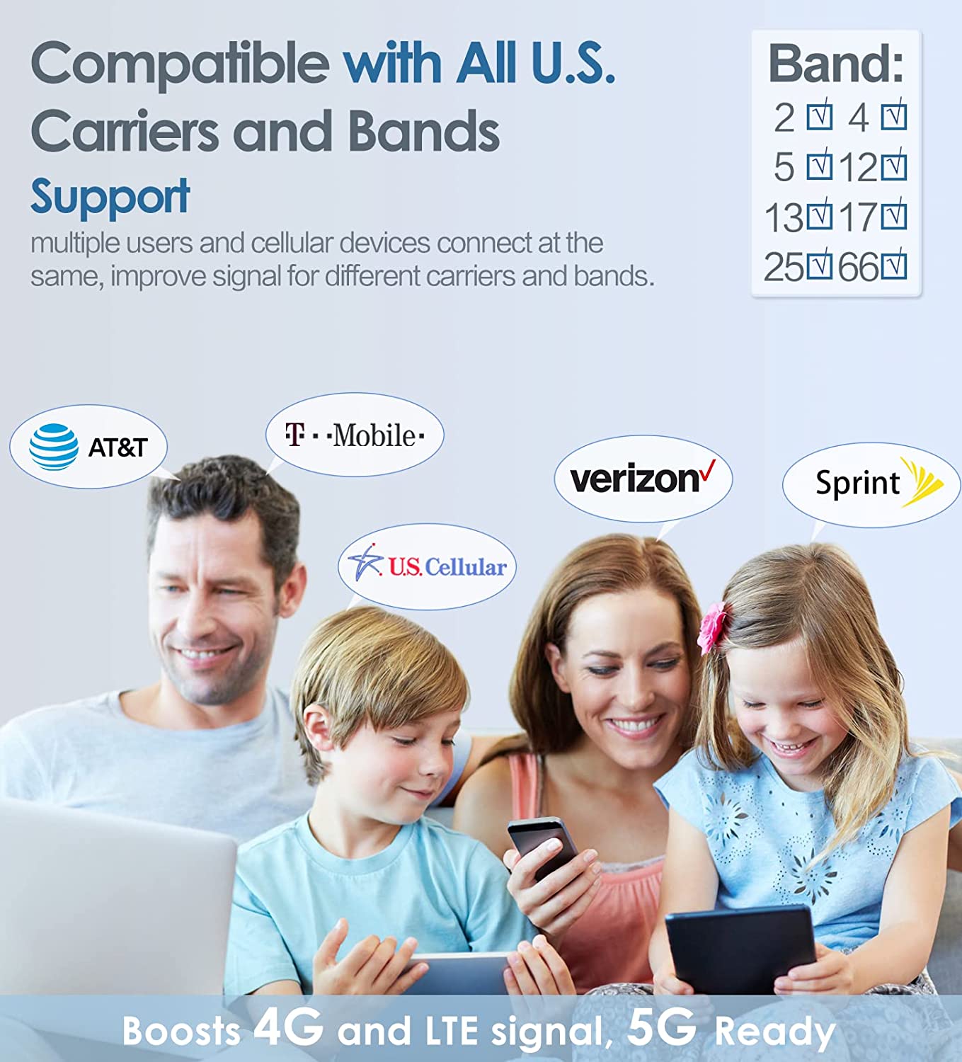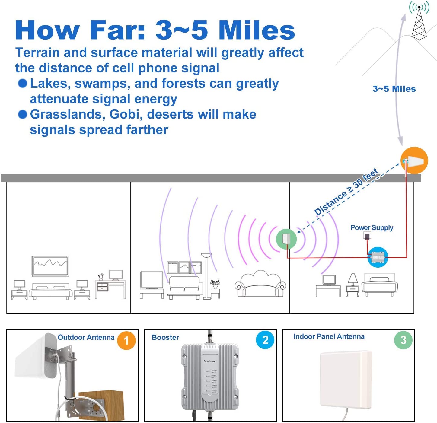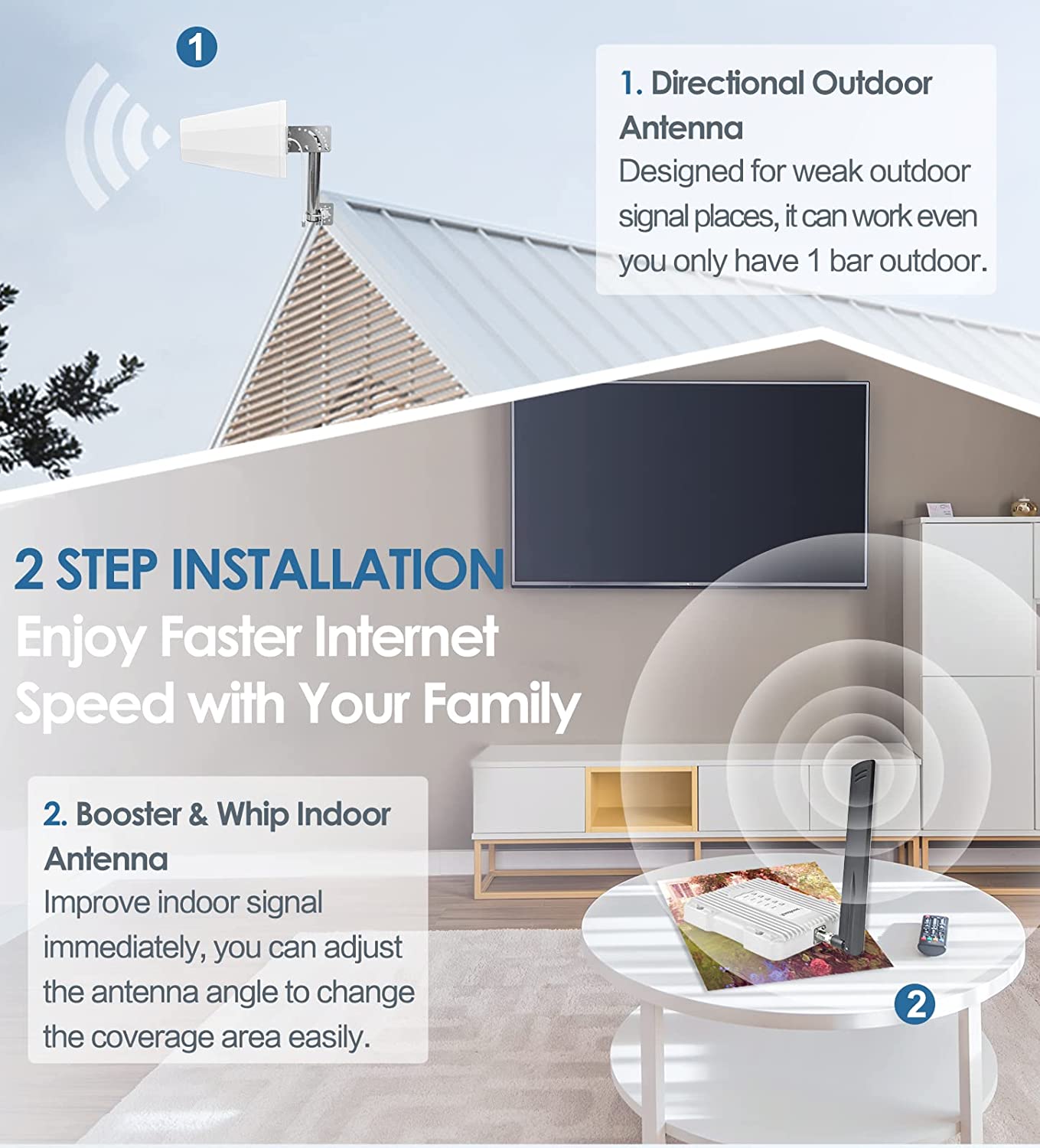 • Boosts Voice Signal: Enhances the signal up to 100X, with a coverage area of 2500 sq. Ft. allowing everyone to enjoy fewer dropped calls, better voice quality, and faster data speeds within its coverage area.(Note: coverage area range depends on the outdoor signal level: 1-2 bars (-100dBm) ~400 sq. Ft. , 3-4 bars (-90dBm) ~1300 sq. Ft. , 5 bars (-80dBm) ~2500 sq. Ft. )