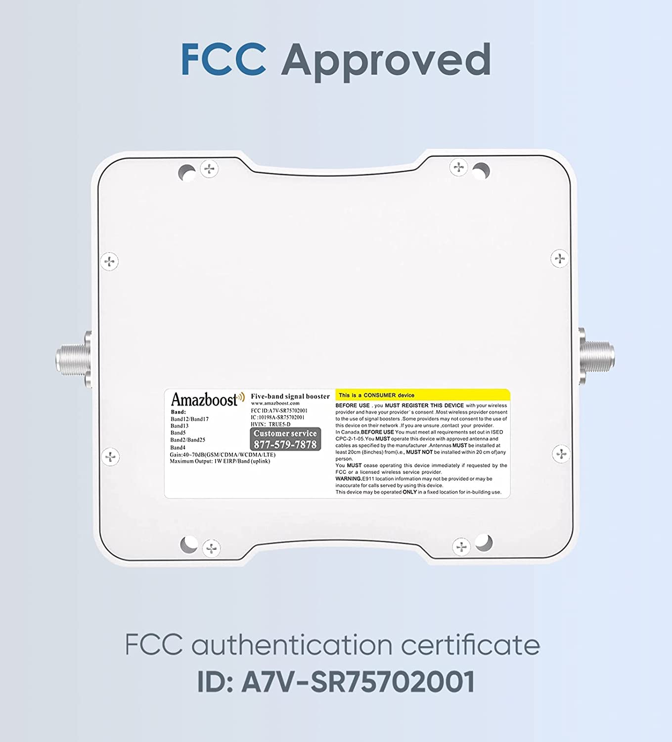 • FCC Approved.FCC ID:A7V-SR75702001 Automatically adjusts system gain and power level to get the optimum result. No manual intervention needed. Easy setup. Complete installation can be done in half an hour by one person