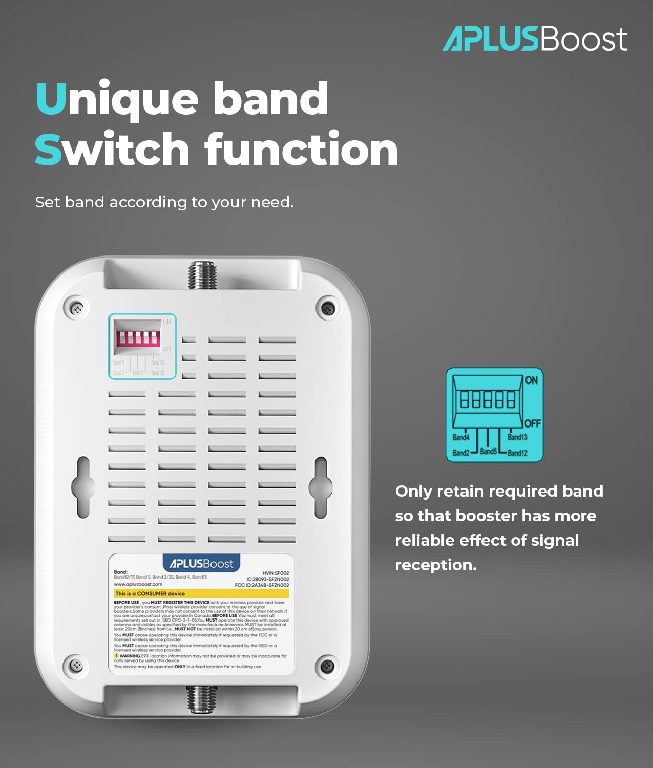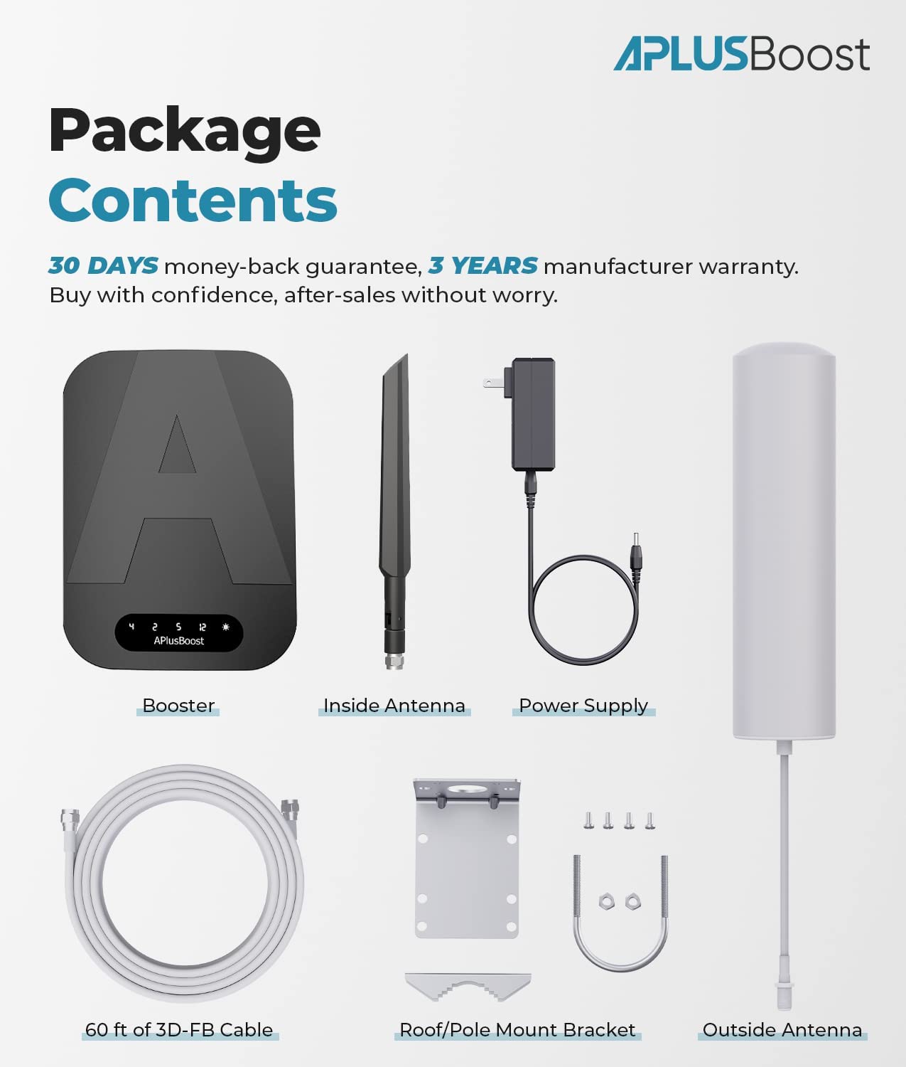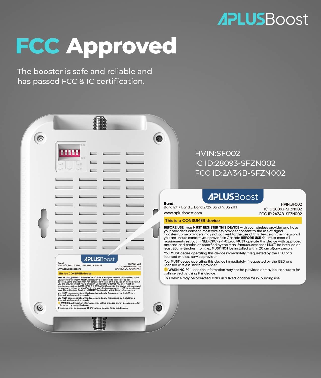 • 【FCC authentication certificate】APlusBoost cell phone signal extender product is safe and reliable, 30-day money-back,  3 Year manufacturer guarantte, FCC certification number:2A34B-SFZN001, (HVIN):SF001., Excellent Technicial Support , if have any problems, please feel free contact to us , we will try our best to solve your problems. All parts are included in the package for one-time purchase without any other subscription fees.