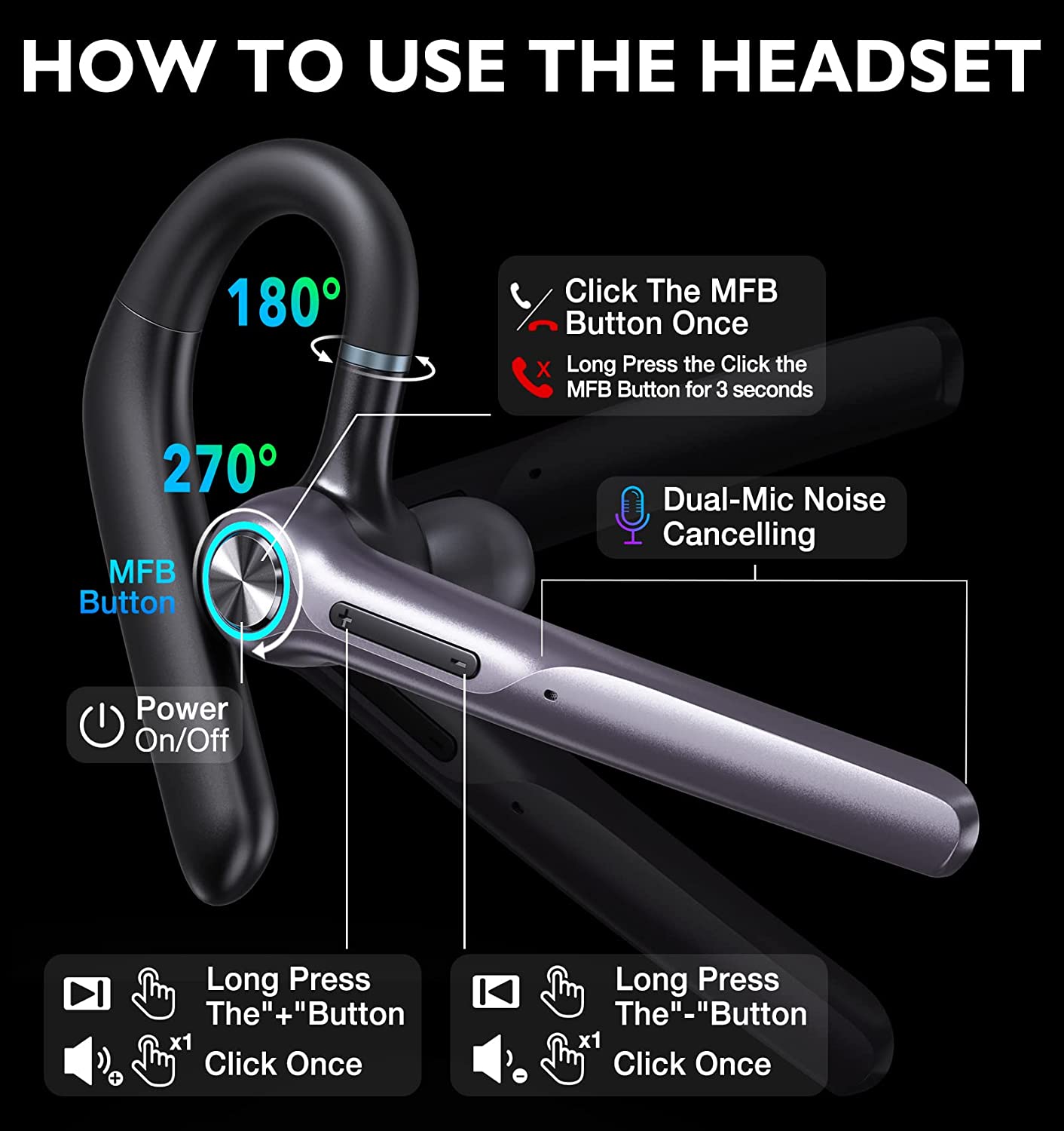 • Dual Mic Noise Canceling Headset -- Wireless headset advanced noise canceling technology and combines 2 built-in HD microphones and high-quality speakers which can eliminate background noise without missing any single conversation details and the call sound will be more transparent.Don't worry about interruptions on listing to music or calling.