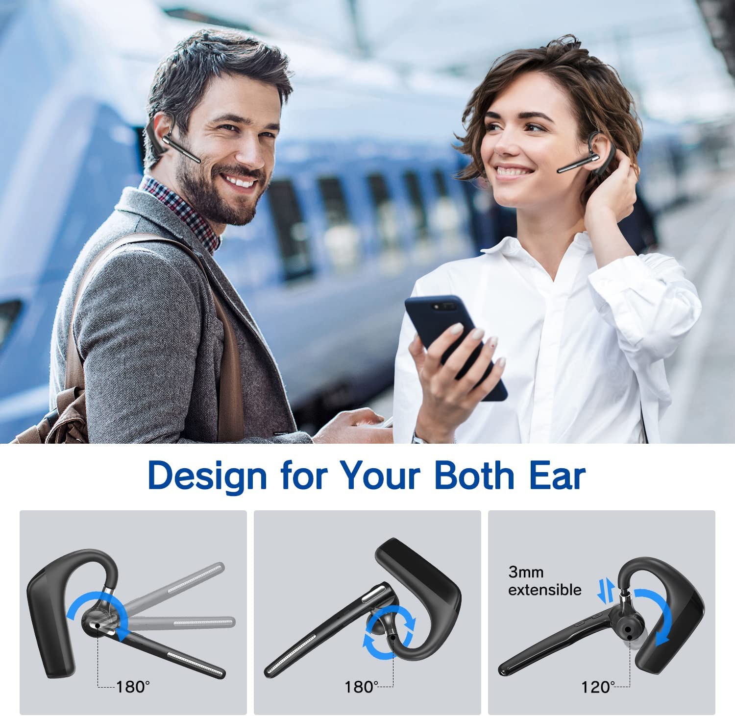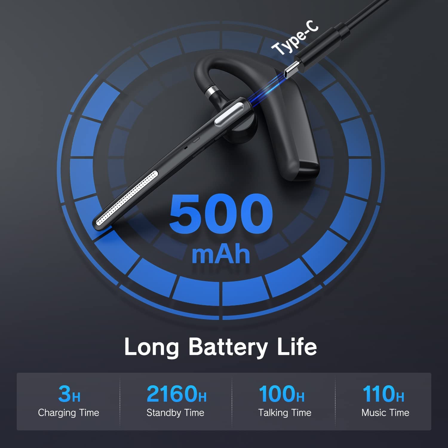 • LONG BATTERY LIFE - The wireless headset build-in a 500mAh high-quality battery that supports 110 hours of music playback time, 100 hours of talk time, and 90 days of standby time with 3 hours of full charge. The TYPE-C charging cable included with your earbuds can be used to charge your headphones. Specially designed for truckers, the Bluetooth headset is the best choice for your long-distance travel.(The "mute" of the earpiece ONLY WORK for cellphone call)