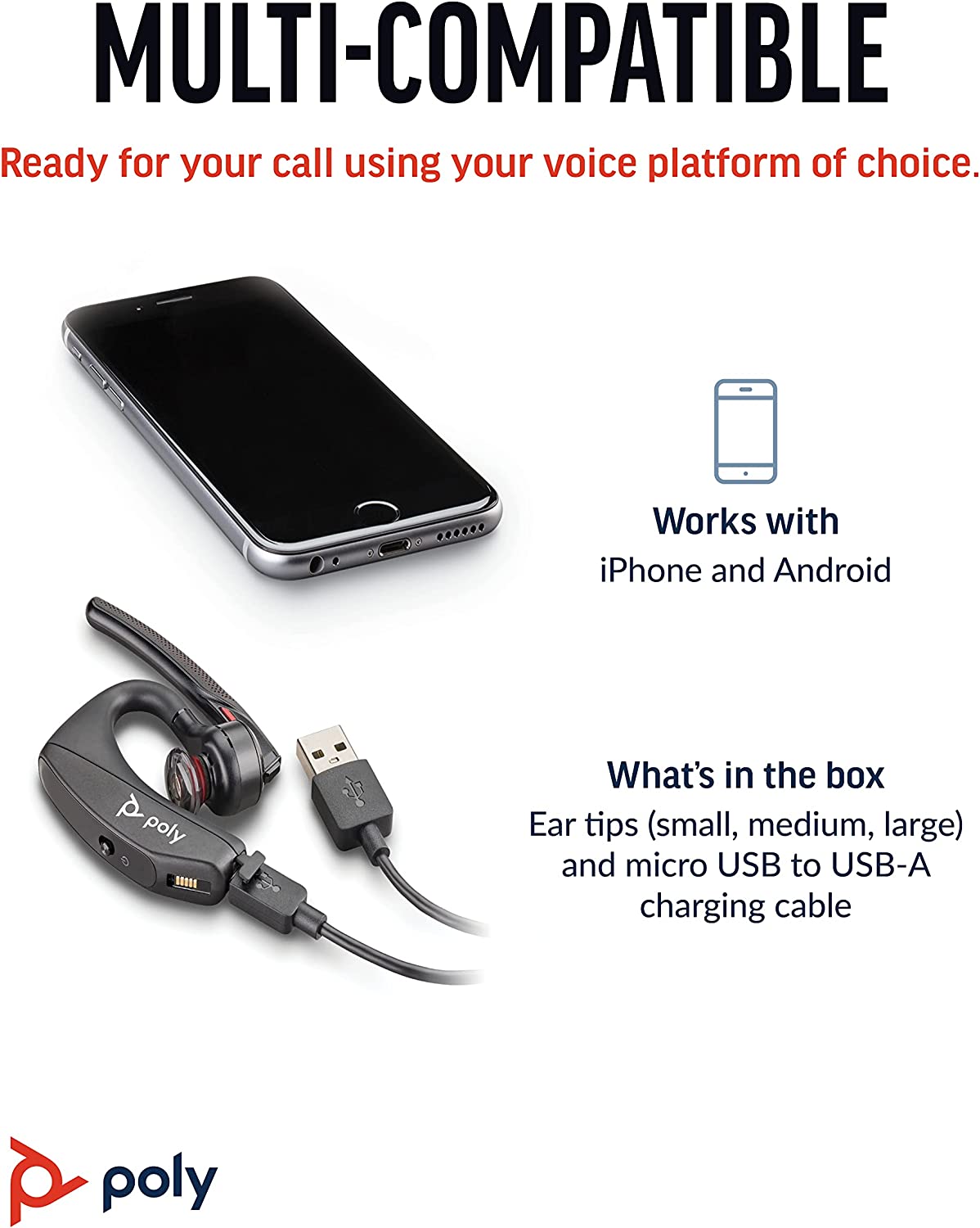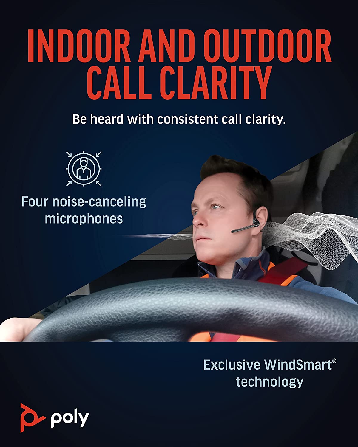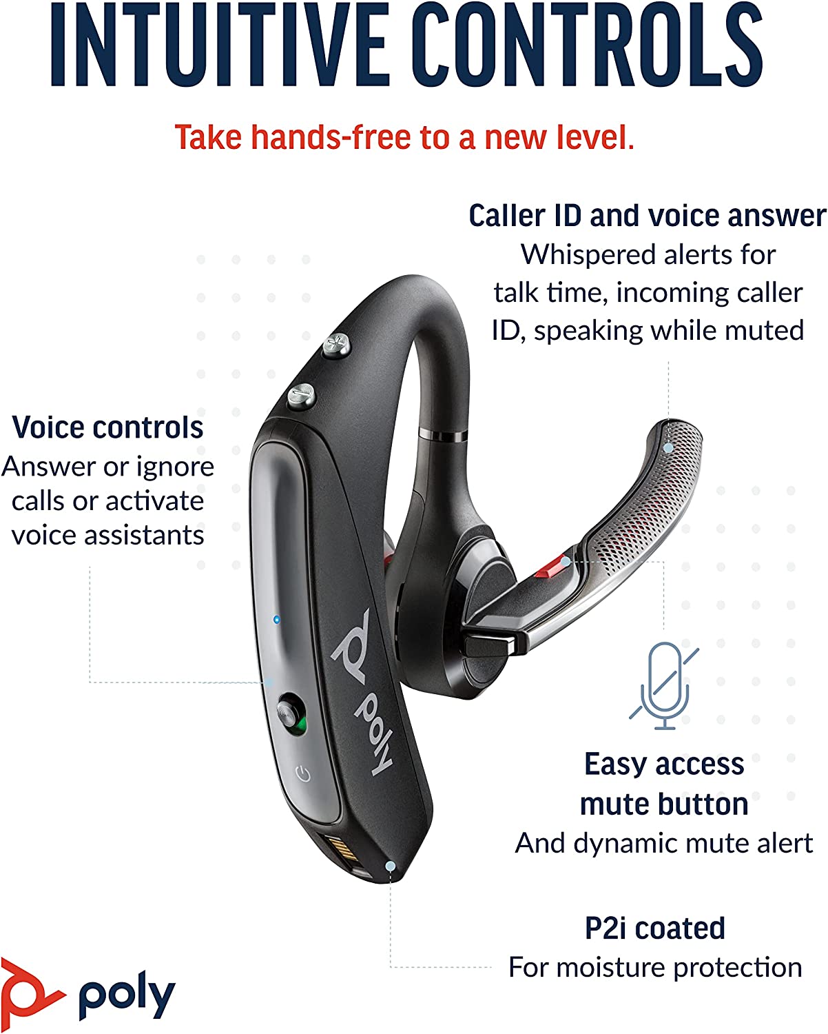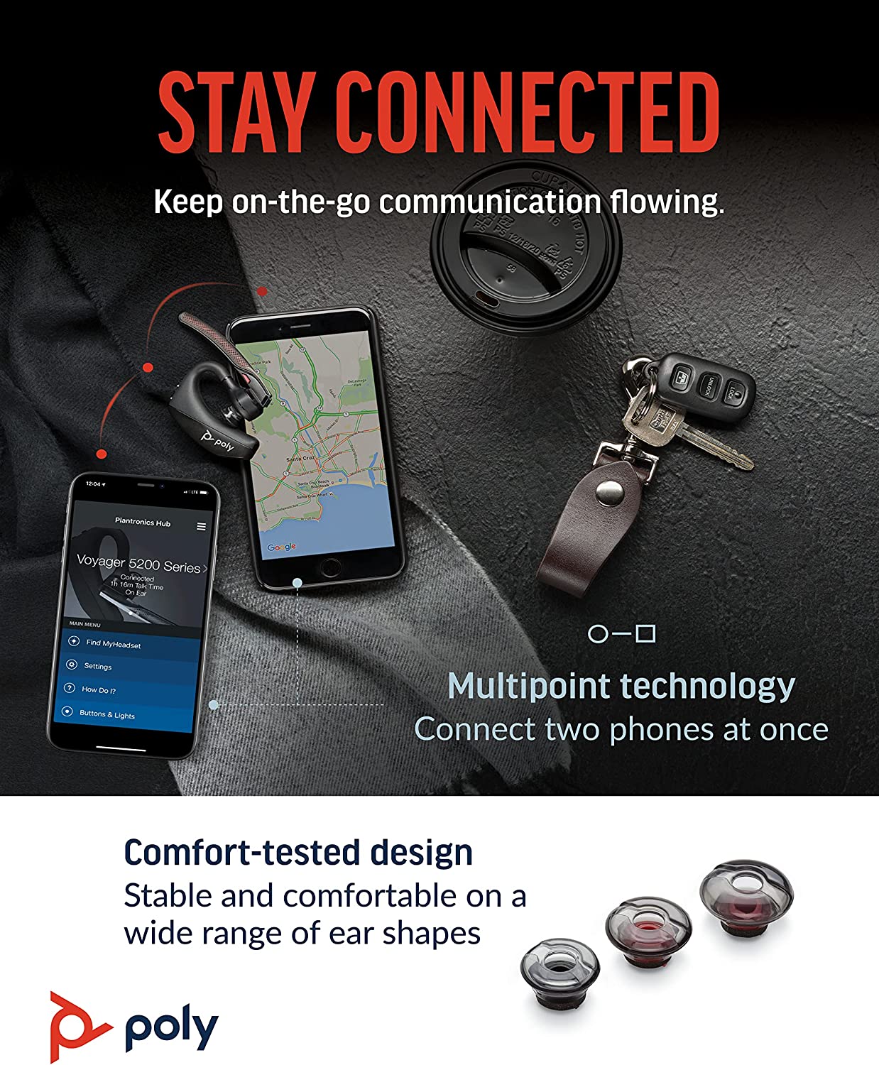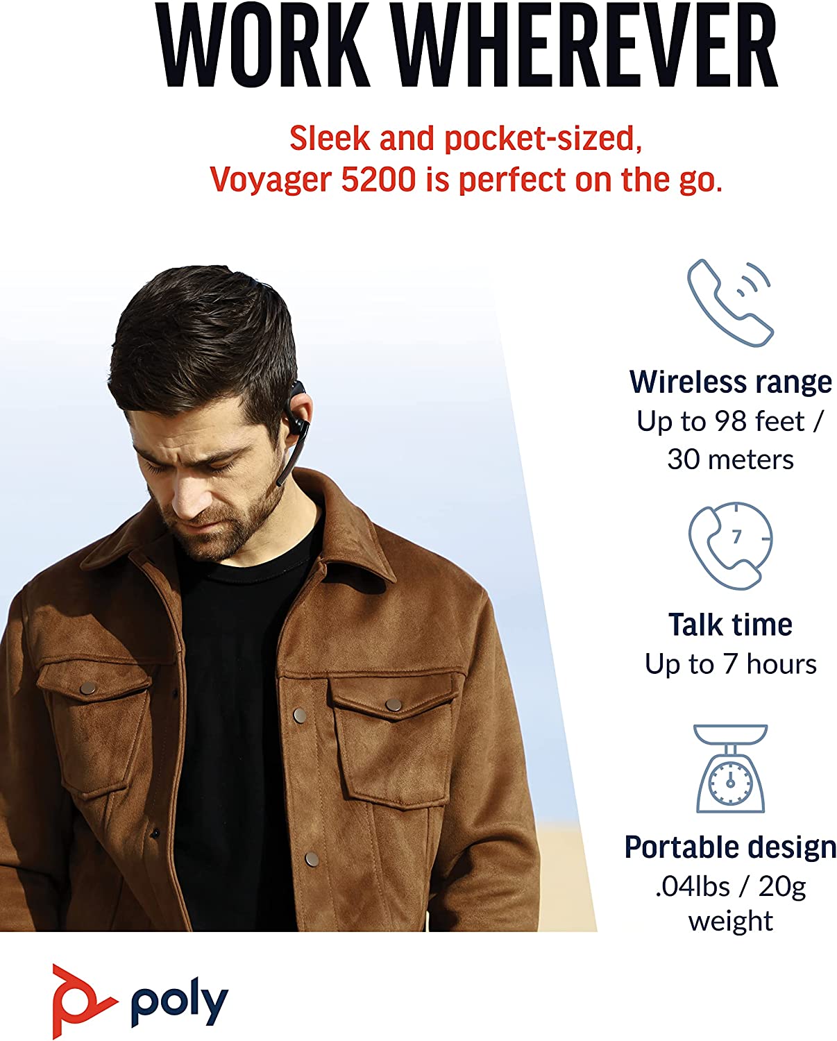 From noisy city streets to inside your car, you’ll be heard clearly with the Voyager 5200 earpiece headset. Sound professional in any environment with your Plantronics headset’s six layers of WindSmart technology and four omnidirectional microphones—the ideal solution for reducing distracting background noise such as wind, chatter, and traffic. With a Bluetooth 5.0 connection, you’ll be able to freely move up to 98 feet (30 meters) as well as connect a second smartphone or tablet with your headset’s multipoint technology. The ergonomic design ensures all-day comfort, from the first call of the day to the last. What’s more, this Bluetooth headset for cell phones is pocket-sized and features a moisture-resistant P2i coating so you can confidently take calls anywhere. Talk hands-free and simplify mobile communications with smart assistance features such as caller ID and talk-time alerts, voice controls like Answer or Ignore, and a dedicated button for activating Siri, Google Assistant, or Cortana. Plus, your headset works smoothly with iPhone, Android, and other leading smartphones. With the Voyager 5200, anywhere is a great place to talk.